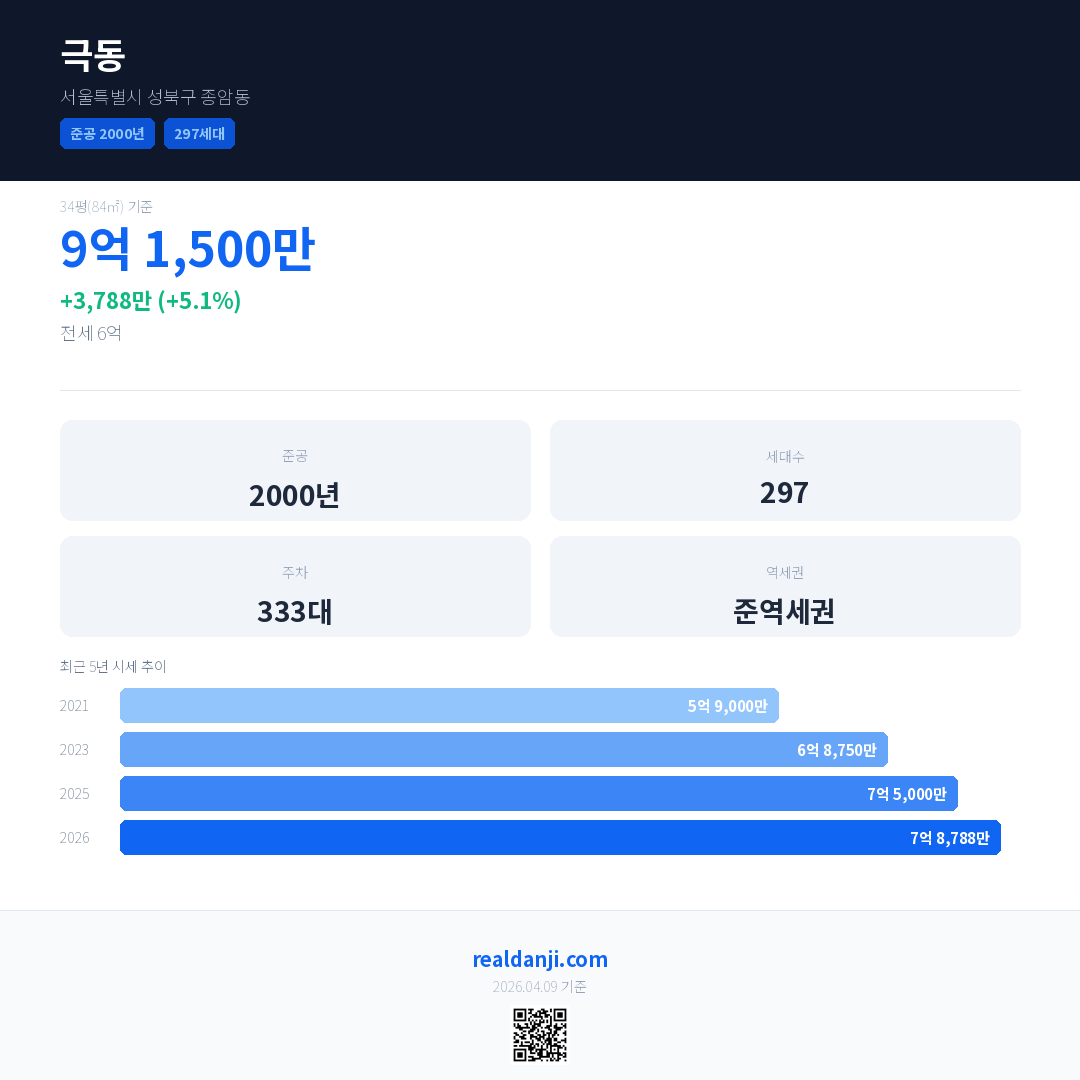 극동 국민평형 기준 2026년 평균 거래가는 7억 8,788만으로, 전년 대비 5.1% 상승 했습니다.