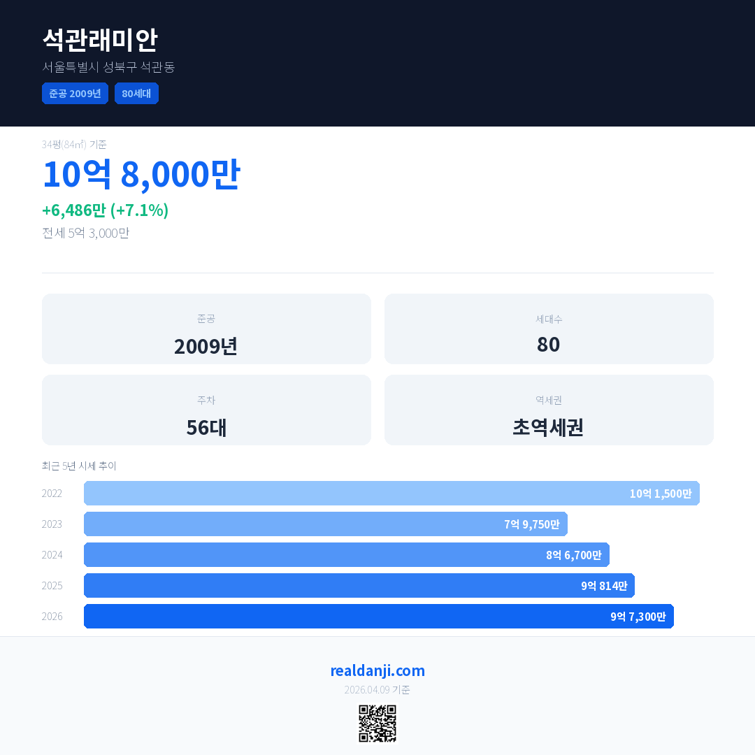석관래미안은(는) 2009년에 준공되었으며, 현재 17년차입니다. 총 80세대 규모입니다.