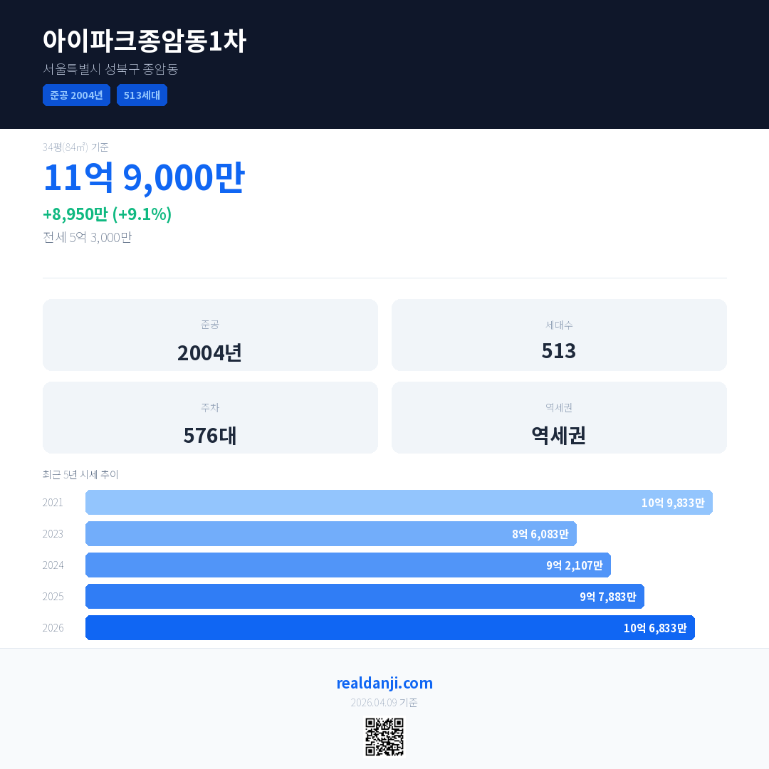 아이파크종암동1차 최근 거래가는 11억 9,000만입니다. (2026-02)
