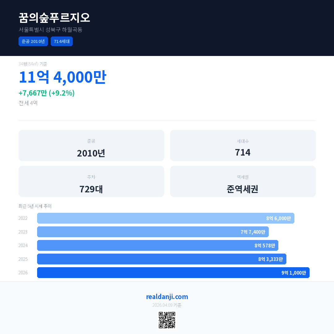꿈의숲푸르지오 최근 거래가는 11억 4,000만입니다. (2026-03)