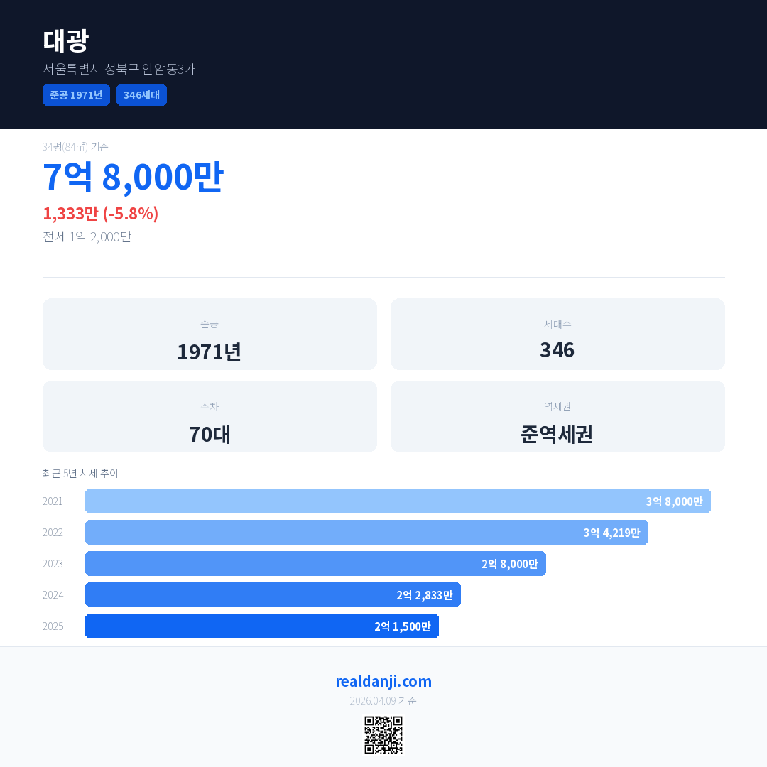 대광 국민평형 기준 2025년 평균 거래가는 2억 1,500만으로, 전년 대비 5.8% 하락 했습니다.