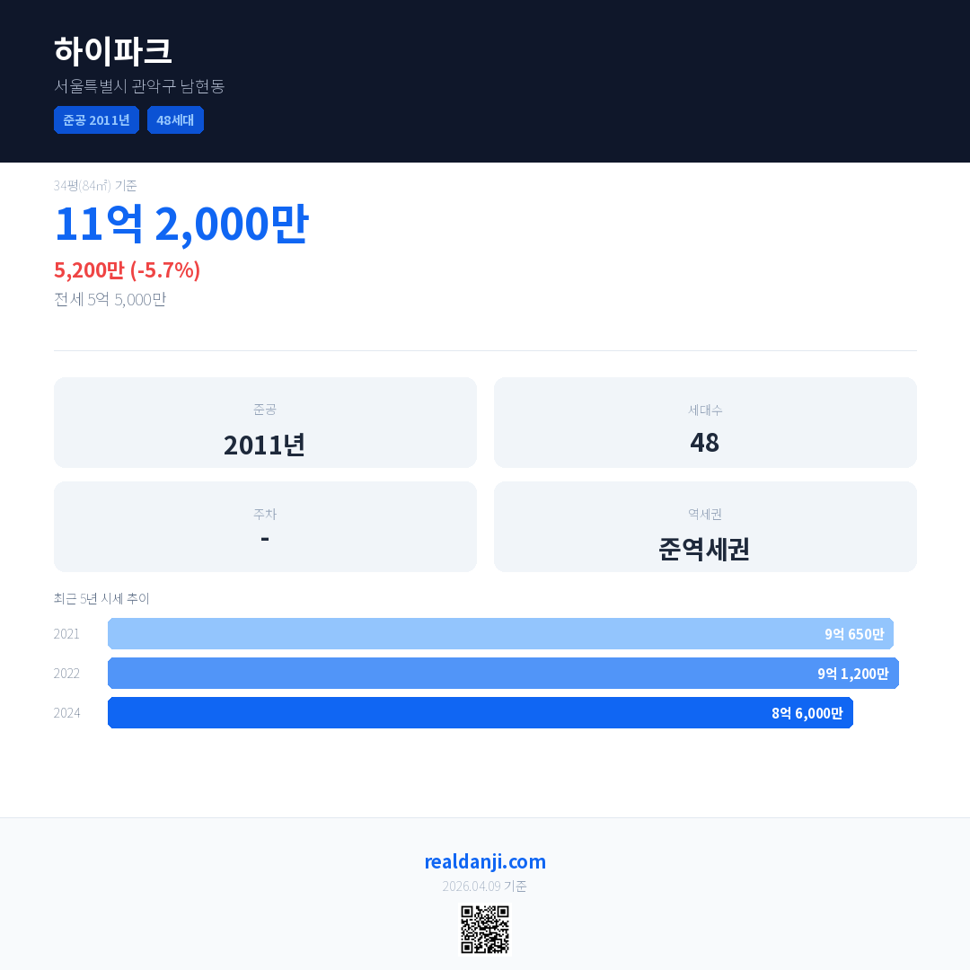 하이파크은(는) 2011년에 준공되었으며, 현재 15년차입니다. 총 48세대 규모입니다.