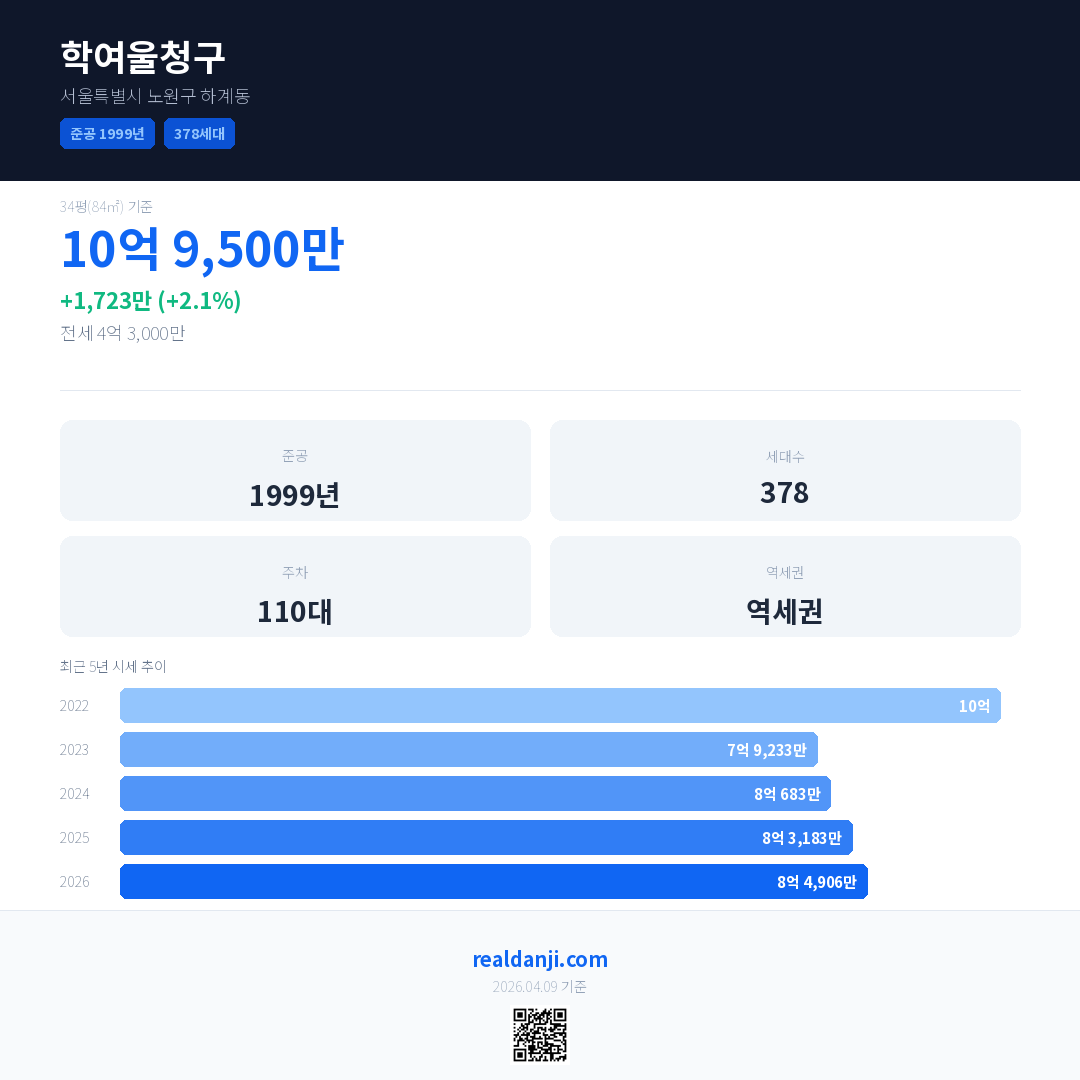 학여울청구은(는) 1999년에 준공되었으며, 현재 27년차입니다. 총 378세대 규모입니다.