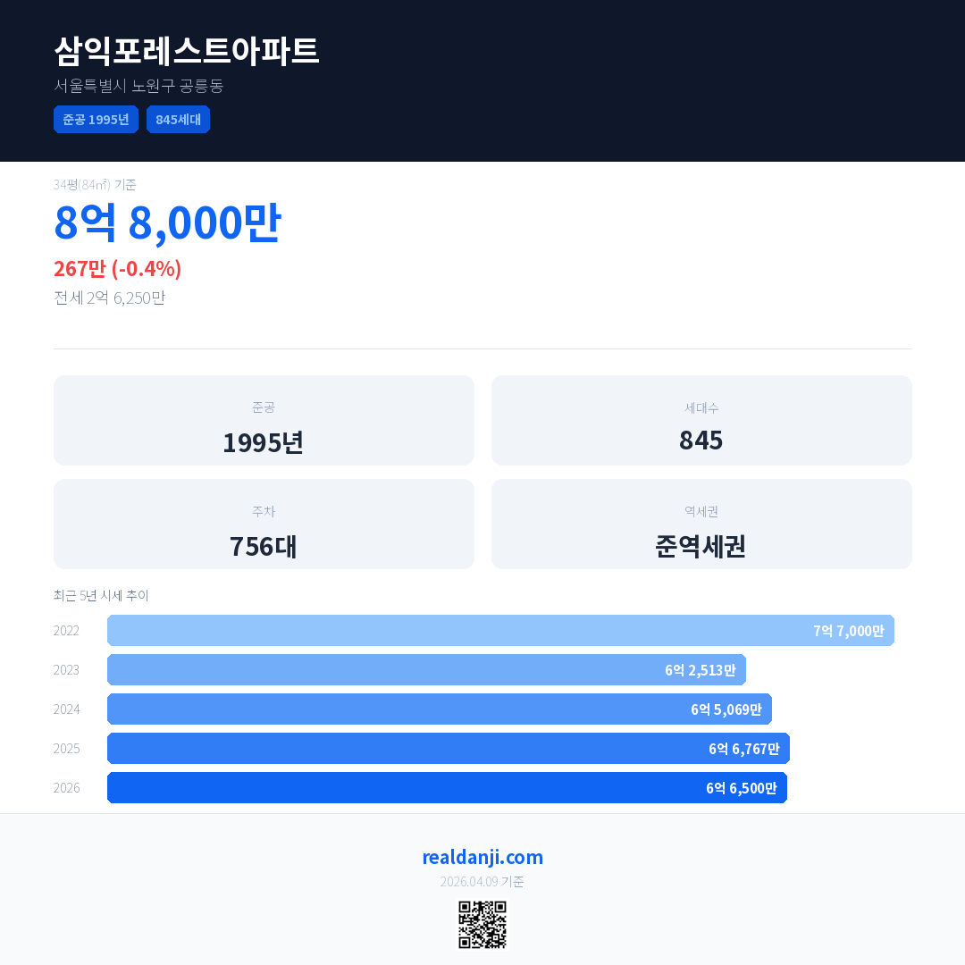 삼익포레스트아파트 국민평형 기준 2026년 평균 거래가는 6억 6,500만으로, 전년 대비 0.4% 하락 했습니다.