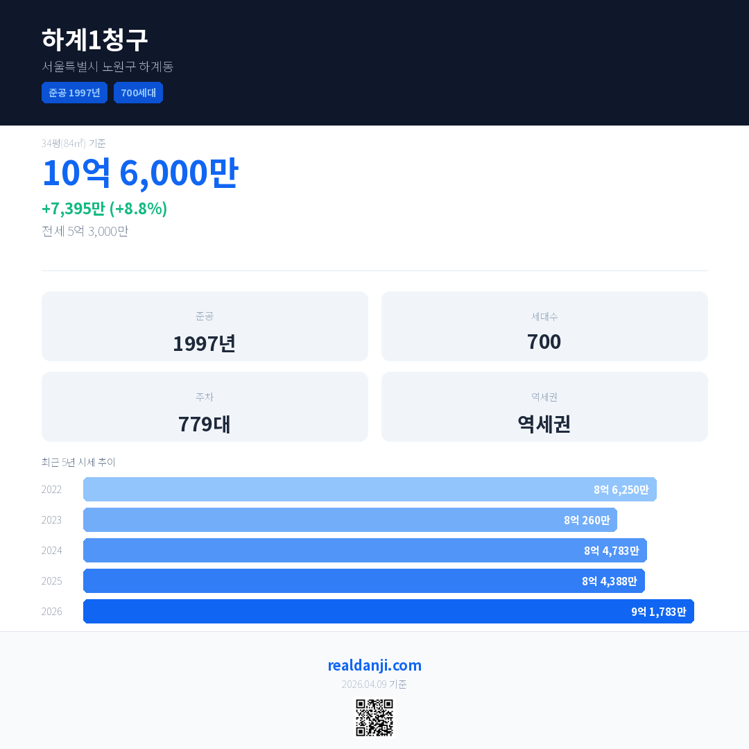 하계1청구 국민평형 기준 2026년 평균 거래가는 9억 1,783만으로, 전년 대비 8.8% 상승 했습니다.