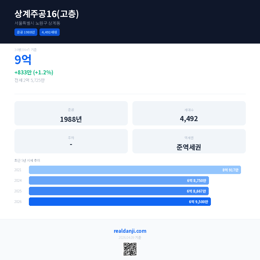 상계주공16(고층) 최근 거래가는 9억입니다. (2026-03)