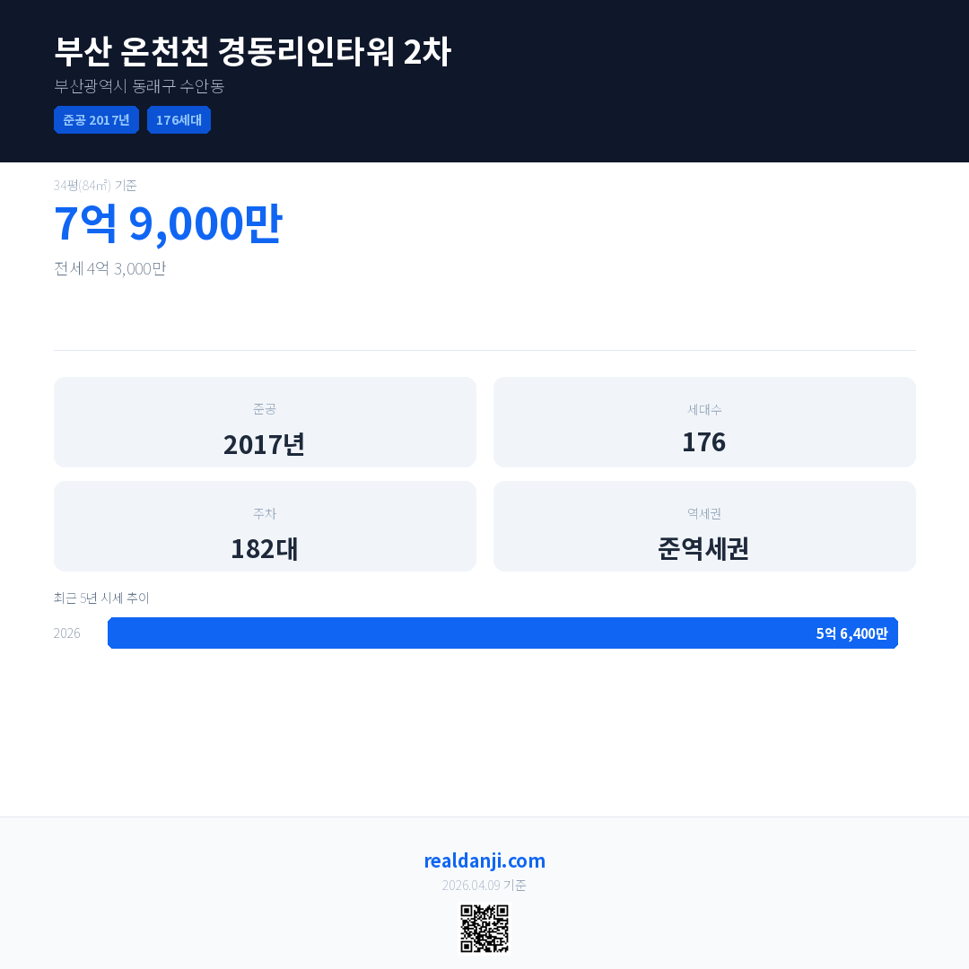 부산 온천천 경동리인타워 2차 최근 거래가는 7억 9,000만입니다. (2026-03)