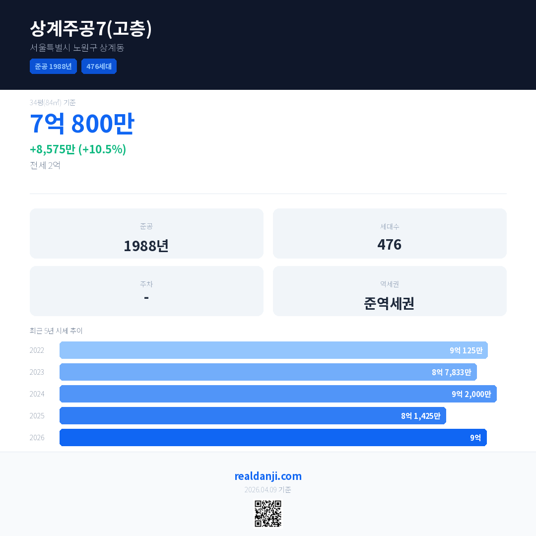 상계주공7(고층) 국민평형 기준 2026년 평균 거래가는 9억으로, 전년 대비 10.5% 상승 했습니다.