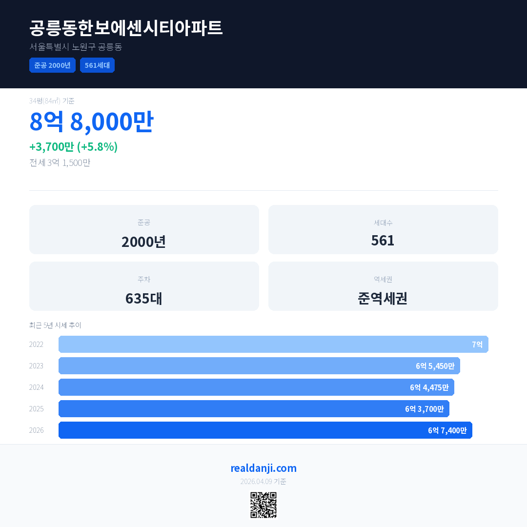 공릉동한보에센시티아파트 국민평형 기준 2026년 평균 거래가는 6억 7,400만으로, 전년 대비 5.8% 상승 했습니다.