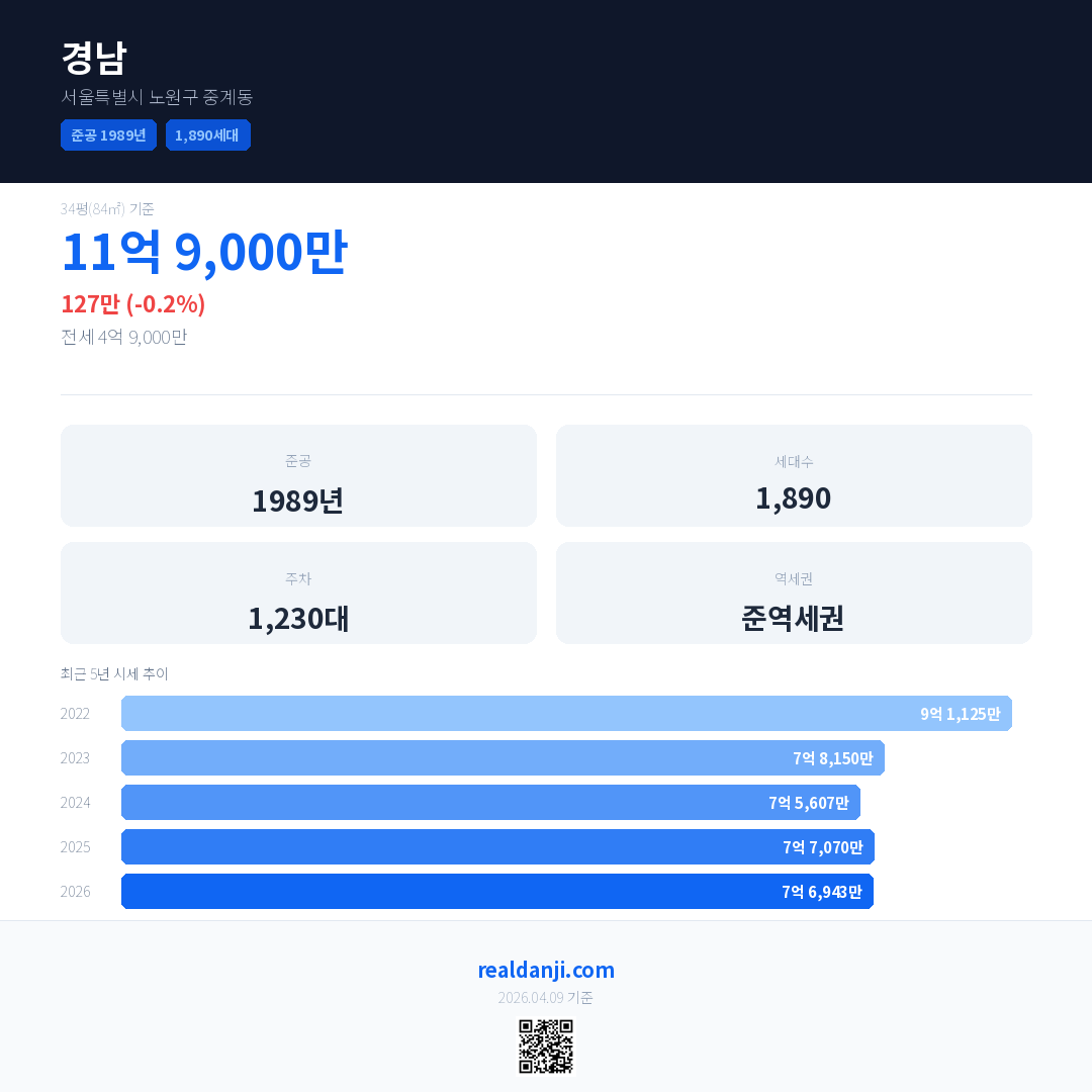 경남은(는) 1989년에 준공되었으며, 현재 37년차입니다. 총 1,890세대 규모입니다.