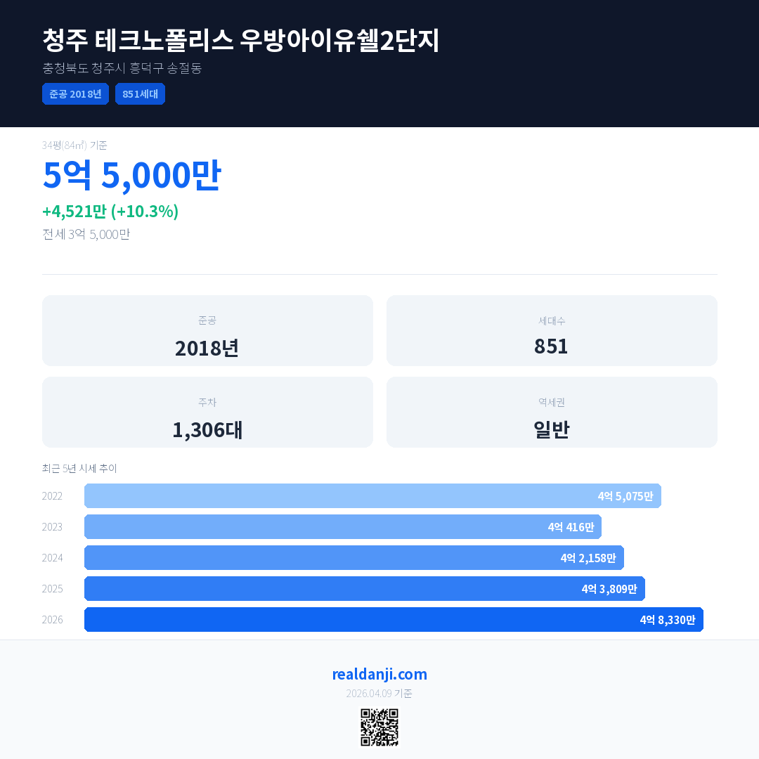 청주 테크노폴리스 우방아이유쉘2단지 국민평형 기준 2026년 평균 거래가는 4억 8,330만으로, 전년 대비 10.3% 상승 했습니다.
