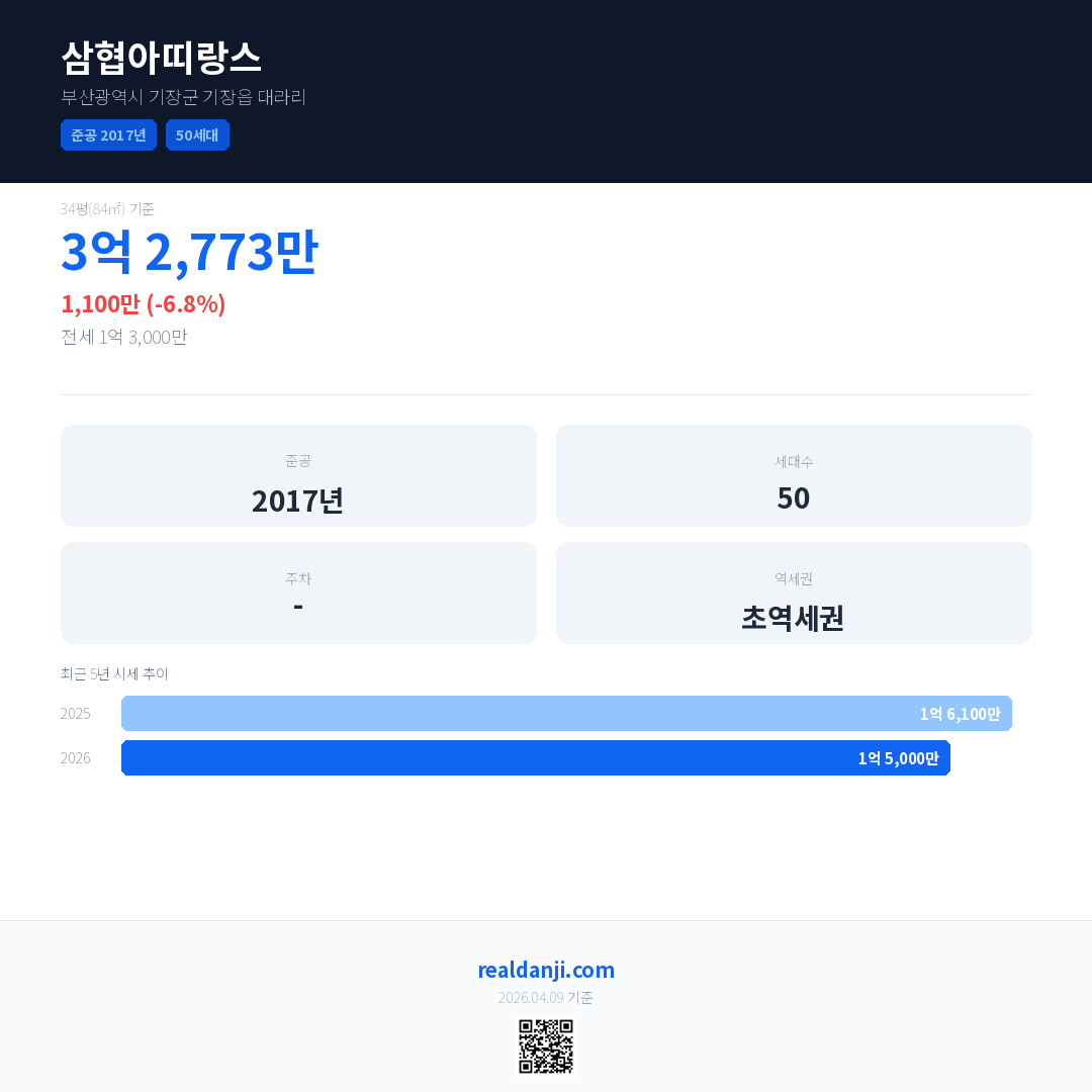 삼협아띠랑스은(는) 2017년에 준공되었으며, 현재 9년차입니다. 총 50세대 규모입니다.