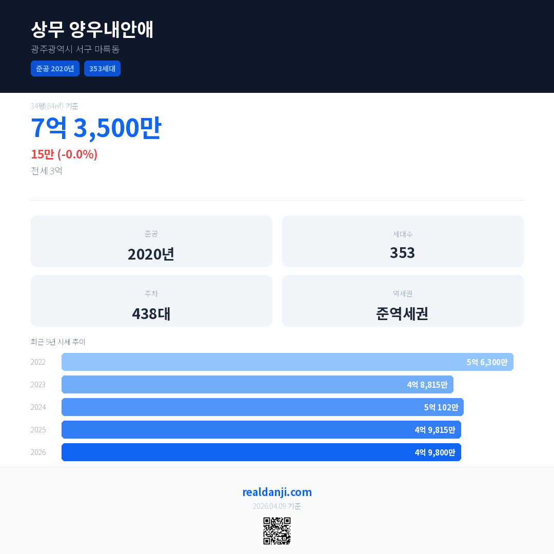 상무 양우내안애 국민평형 기준 2026년 평균 거래가는 4억 9,800만으로, 전년 대비 0.0% 하락 했습니다.