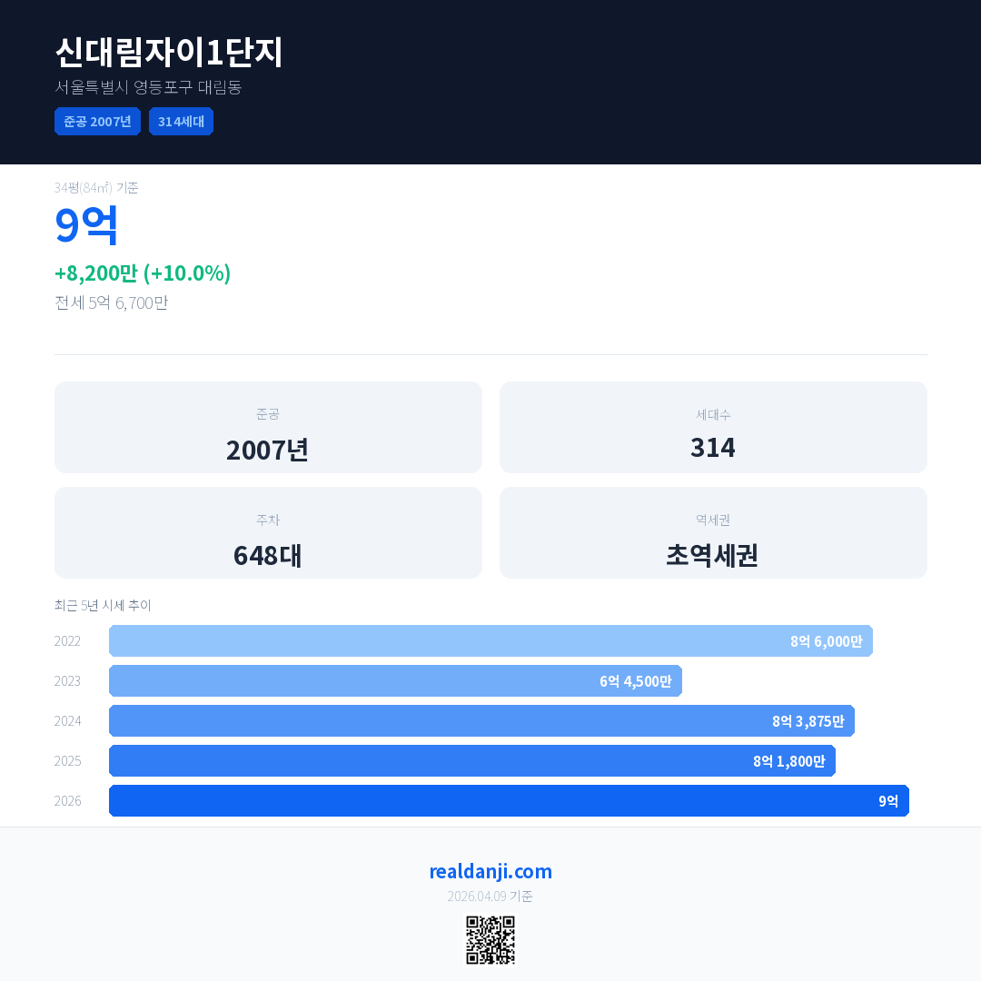 신대림자이1단지 국민평형 기준 2026년 평균 거래가는 9억으로, 전년 대비 10.0% 상승 했습니다.