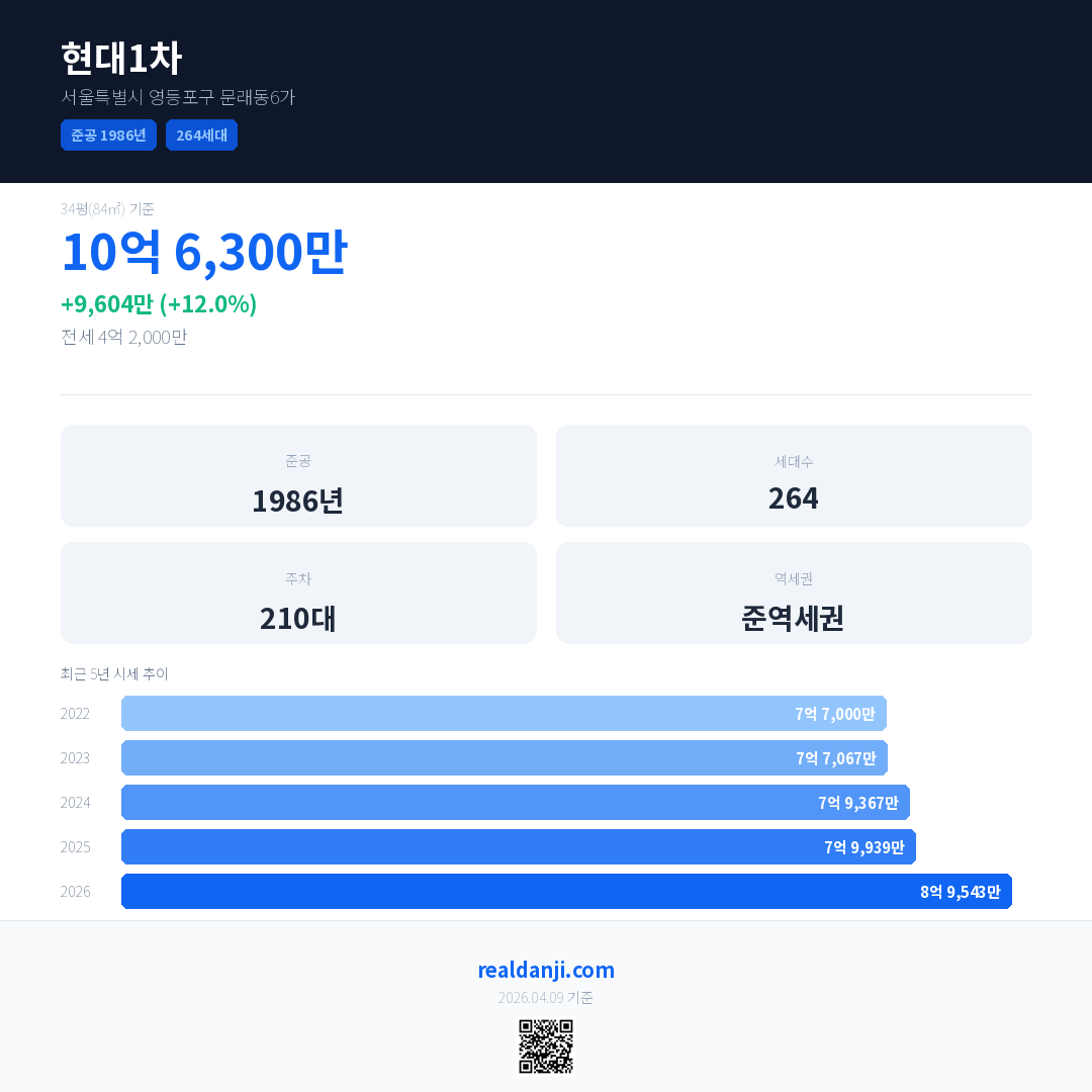 현대1차 국민평형 기준 2026년 평균 거래가는 8억 9,543만으로, 전년 대비 12.0% 상승 했습니다.