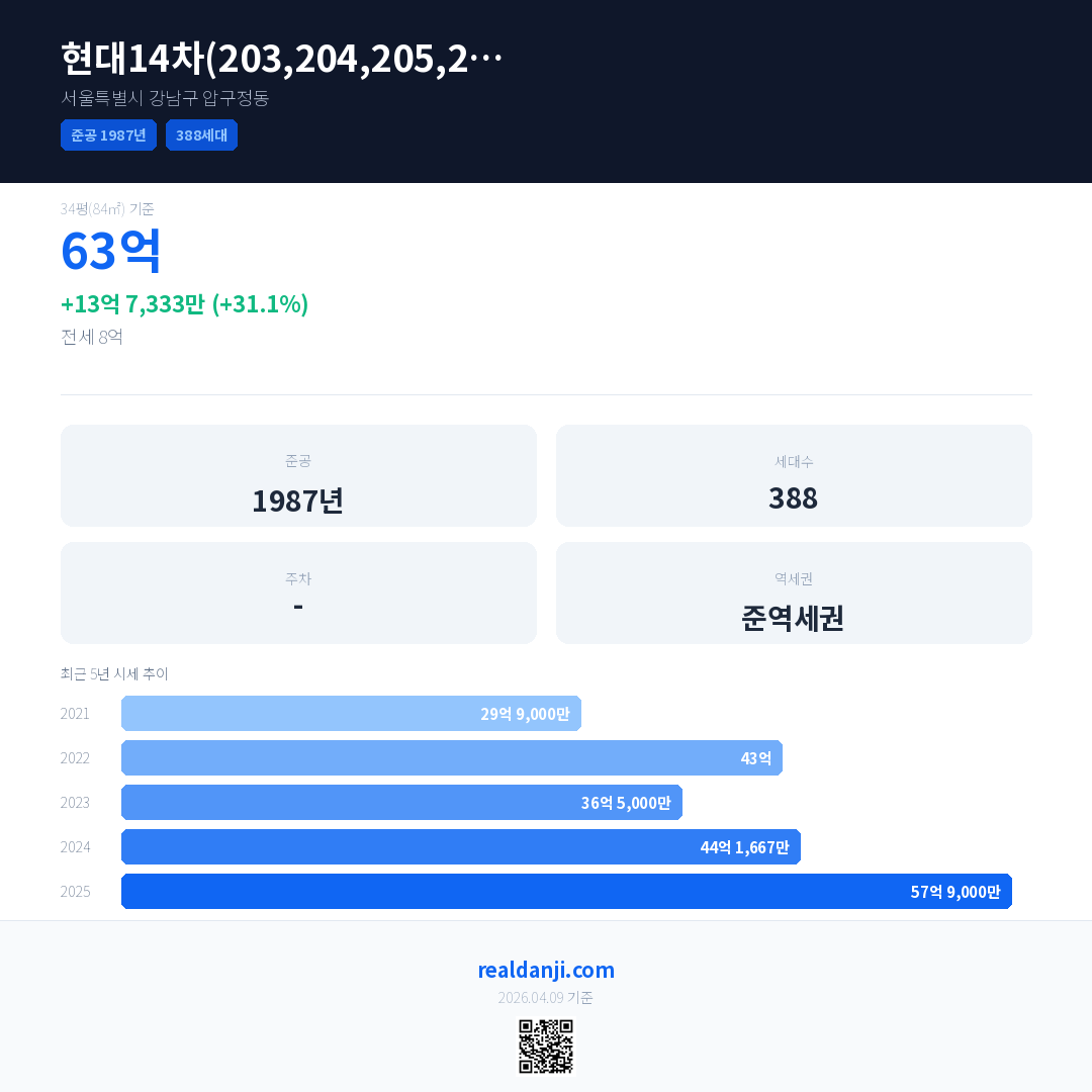 현대14차(203,204,205,206동) 국민평형 기준 2025년 평균 거래가는 57억 9,000만으로, 전년 대비 31.1% 상승 했습니다.