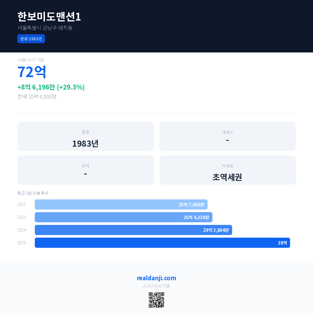 한보미도맨션1 국민평형 기준 2025년 평균 거래가는 38억으로, 전년 대비 29.3% 상승 했습니다.
