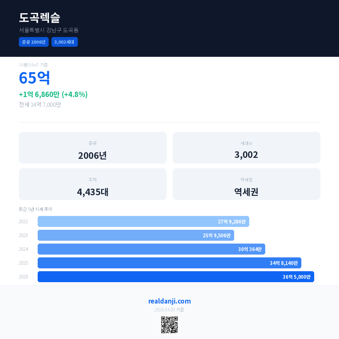 도곡렉슬 국민평형 기준 2026년 평균 거래가는 36억 5,000만으로, 전년 대비 4.8% 상승 했습니다.