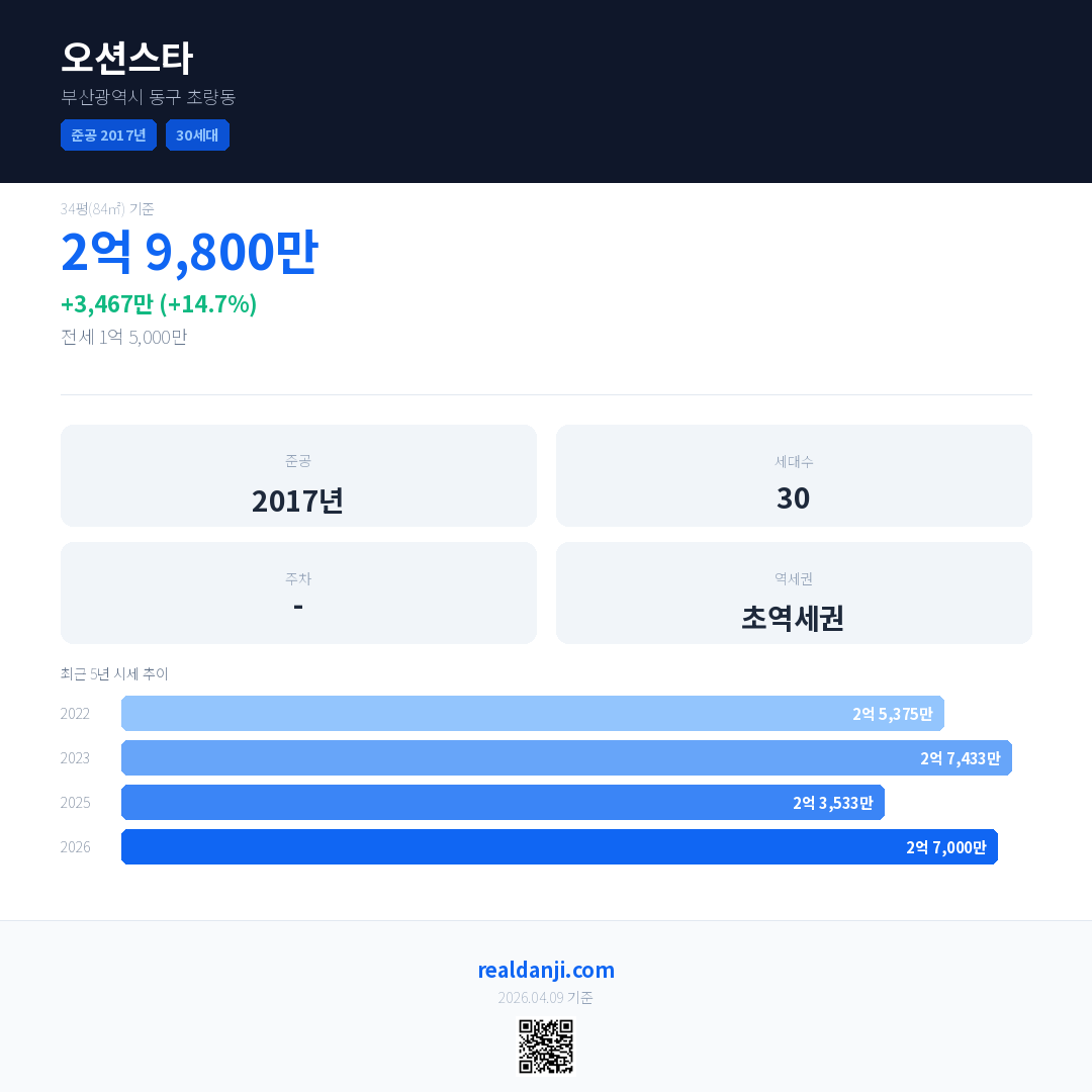 오션스타은(는) 2017년에 준공되었으며, 현재 9년차입니다. 총 30세대 규모입니다.