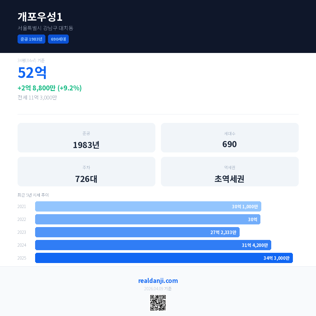 개포우성1은(는) 1983년에 준공되었으며, 현재 43년차입니다. 총 690세대 규모입니다.