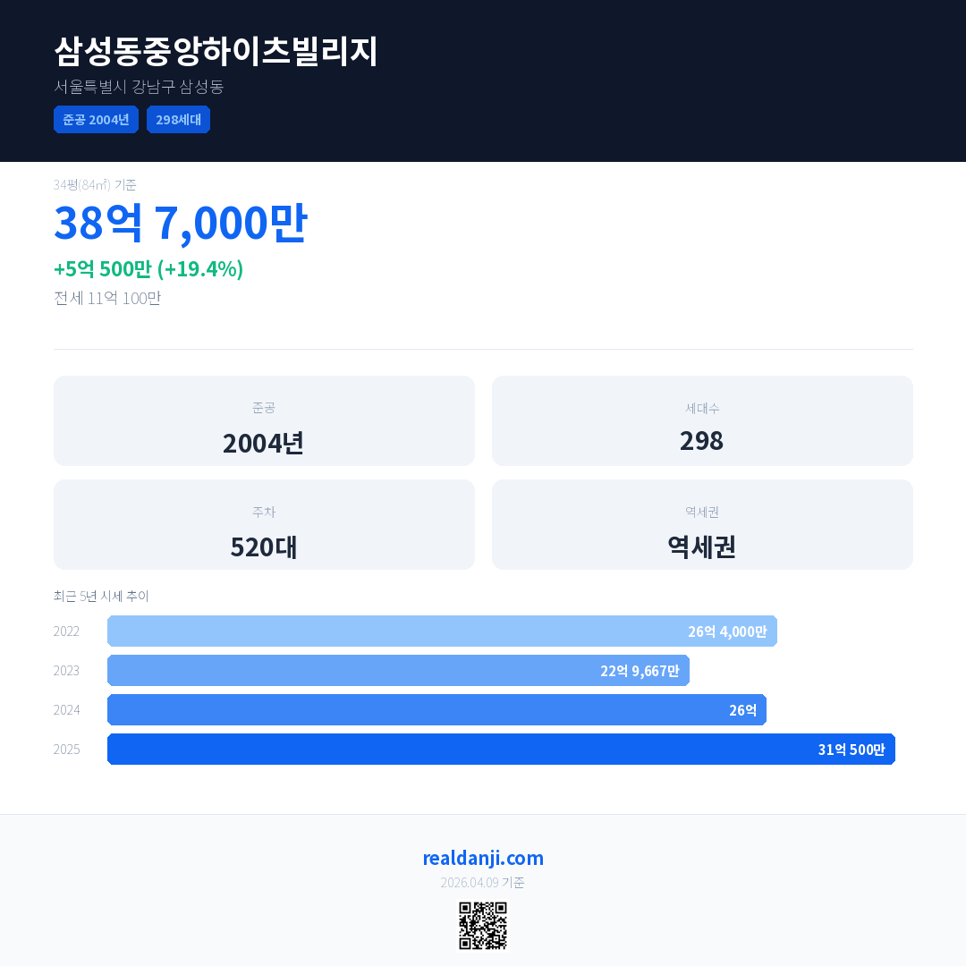 삼성동중앙하이츠빌리지 국민평형 기준 2025년 평균 거래가는 31억 500만으로, 전년 대비 19.4% 상승 했습니다.
