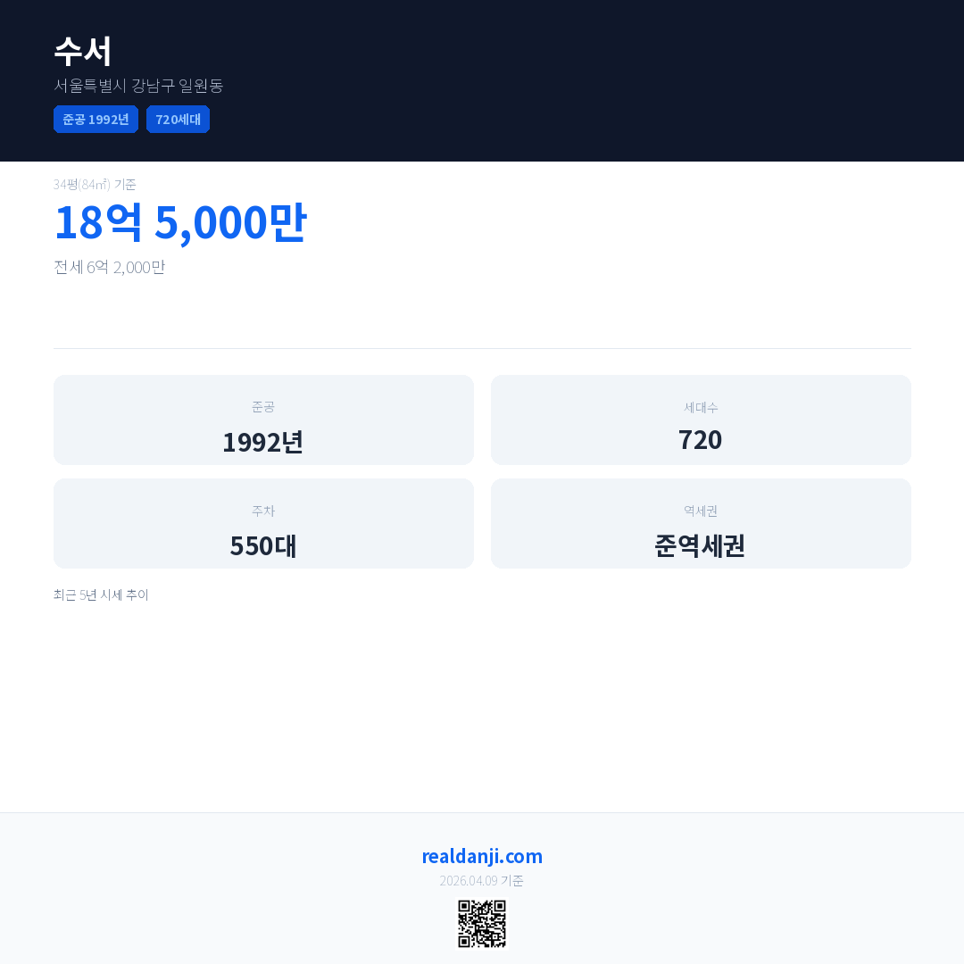 수서 최근 거래가는 18억 5,000만입니다. (2026-03)