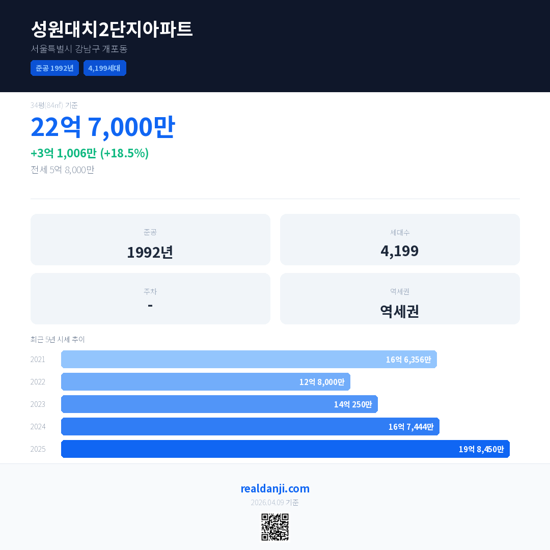 성원대치2단지아파트 국민평형 기준 2025년 평균 거래가는 19억 8,450만으로, 전년 대비 18.5% 상승 했습니다.