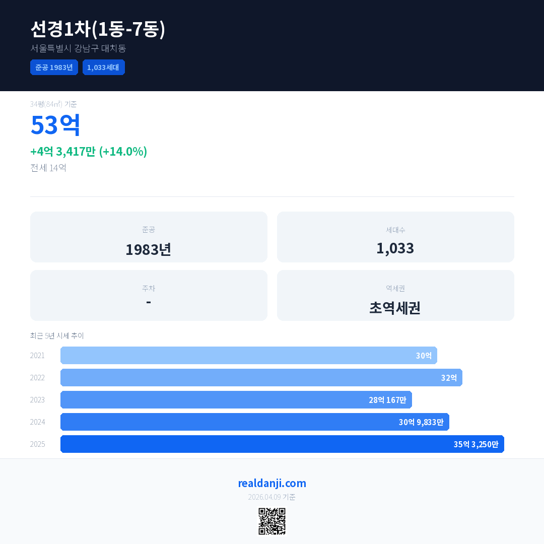선경1차(1동-7동) 국민평형 기준 2025년 평균 거래가는 35억 3,250만으로, 전년 대비 14.0% 상승 했습니다.