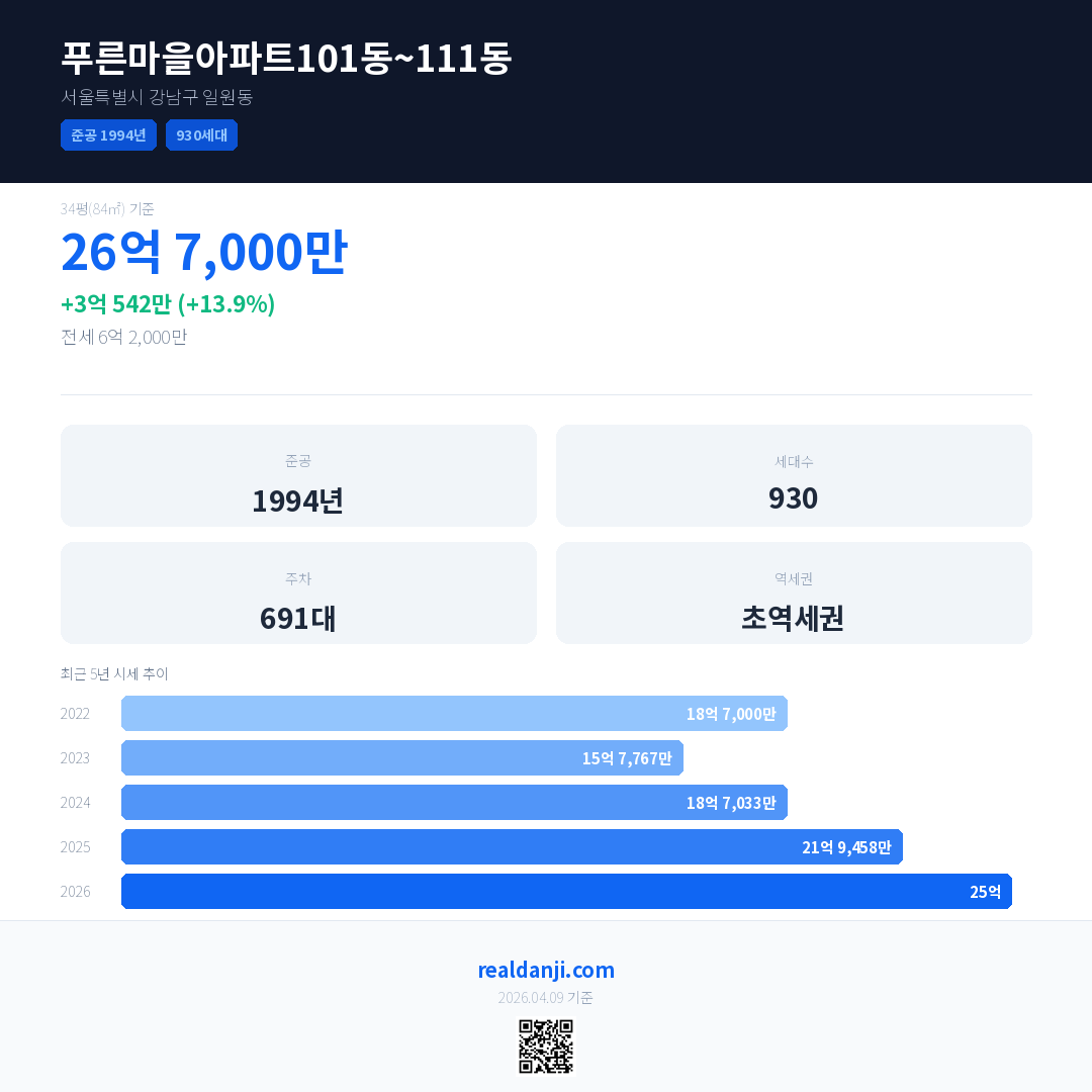 푸른마을아파트101동~111동 국민평형 기준 2026년 평균 거래가는 25억으로, 전년 대비 13.9% 상승 했습니다.