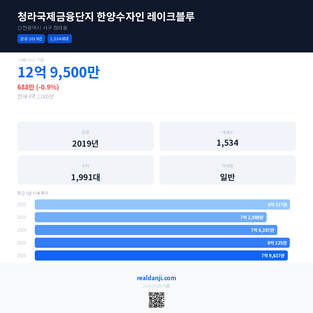 청라국제금융단지 한양수자인 레이크블루 국민평형 기준 2026년 평균 거래가는 7억 9,637만으로, 전년 대비 0.9% 하락 했습니다.
