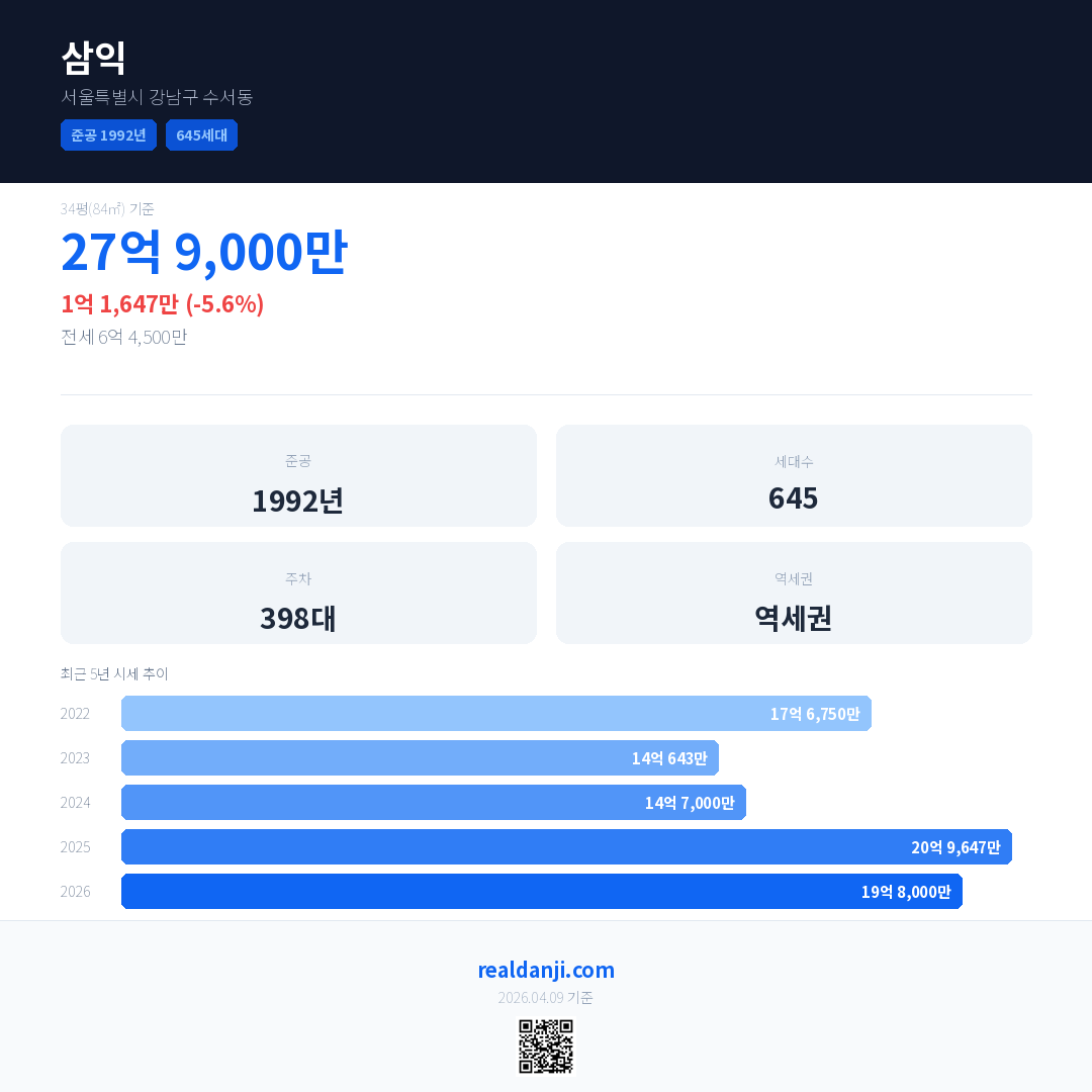 삼익 최근 거래가는 27억 9,000만입니다. (2026-01)