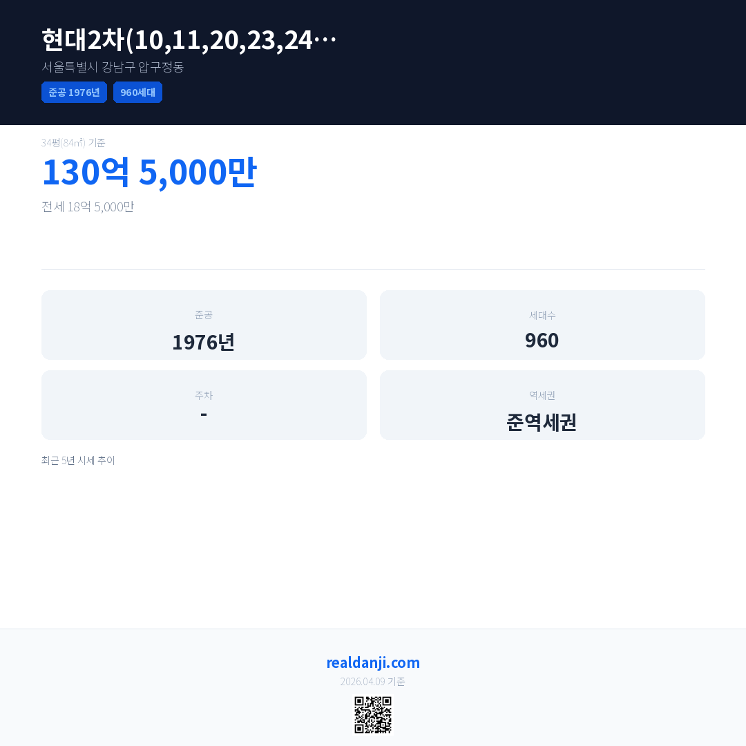 현대2차(10,11,20,23,24,25동) 최근 거래가는 130억 5,000만입니다. (2026-02)