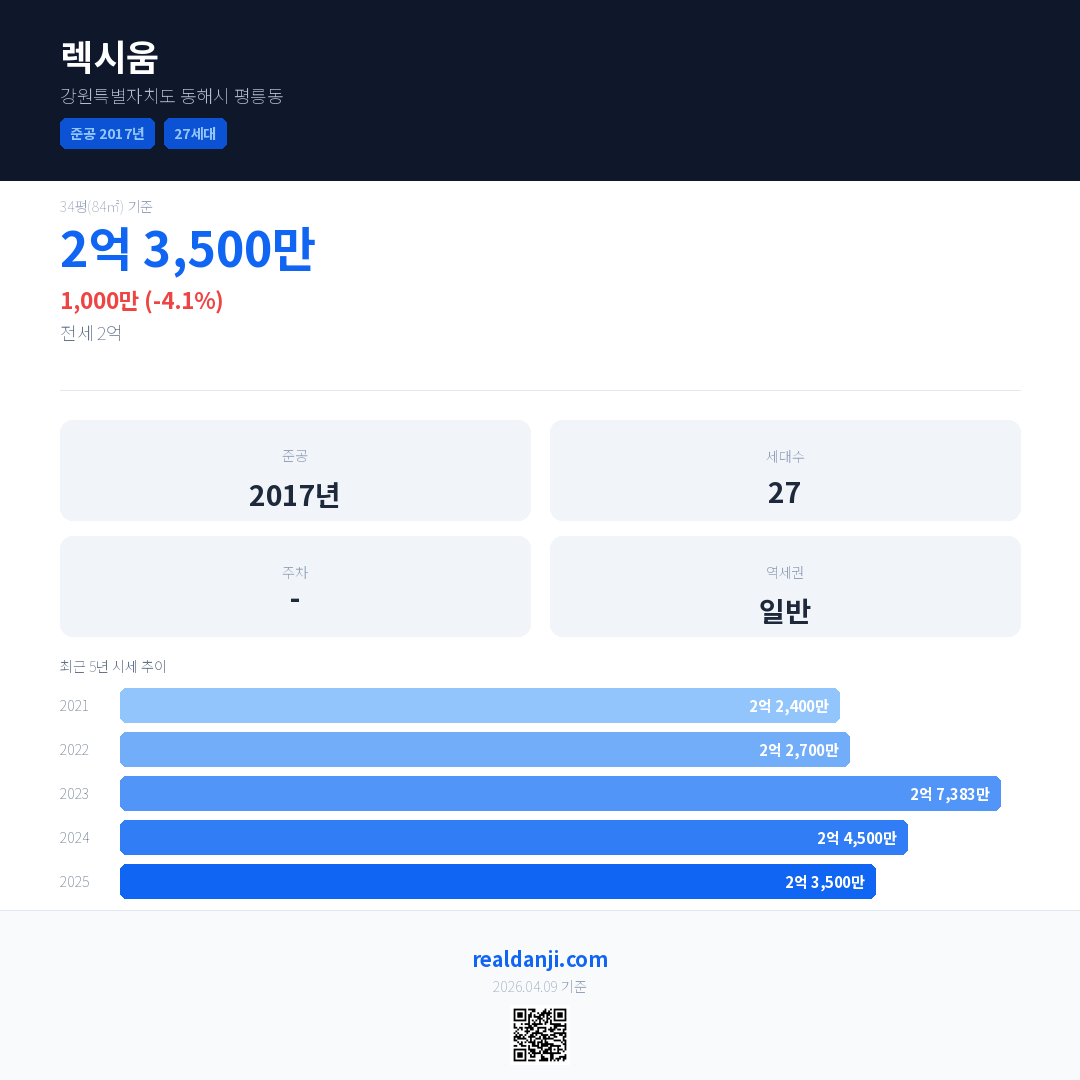 렉시움 국민평형 기준 2025년 평균 거래가는 2억 3,500만으로, 전년 대비 4.1% 하락 했습니다.