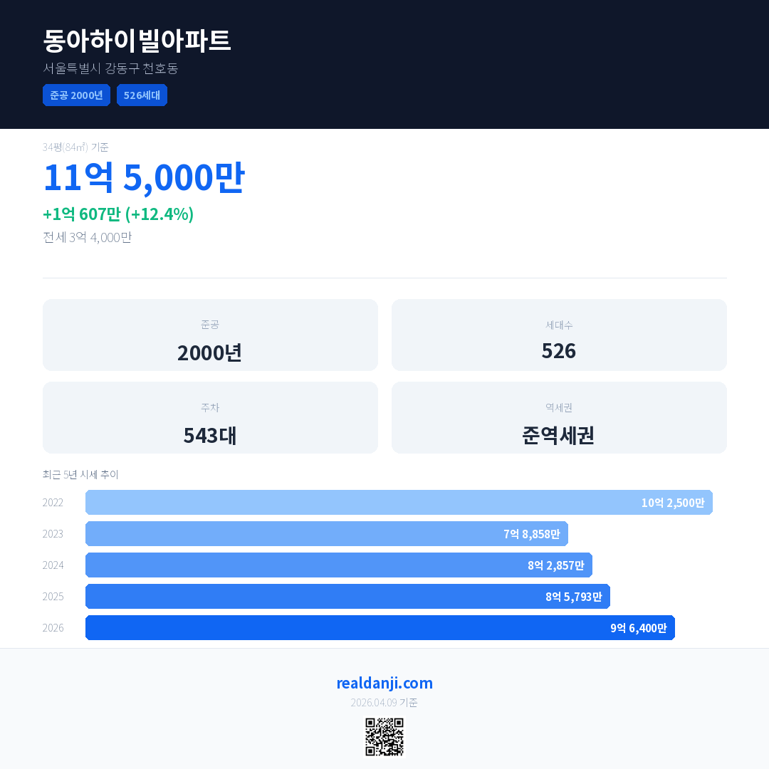 동아하이빌아파트 국민평형 기준 2026년 평균 거래가는 9억 6,400만으로, 전년 대비 12.4% 상승 했습니다.