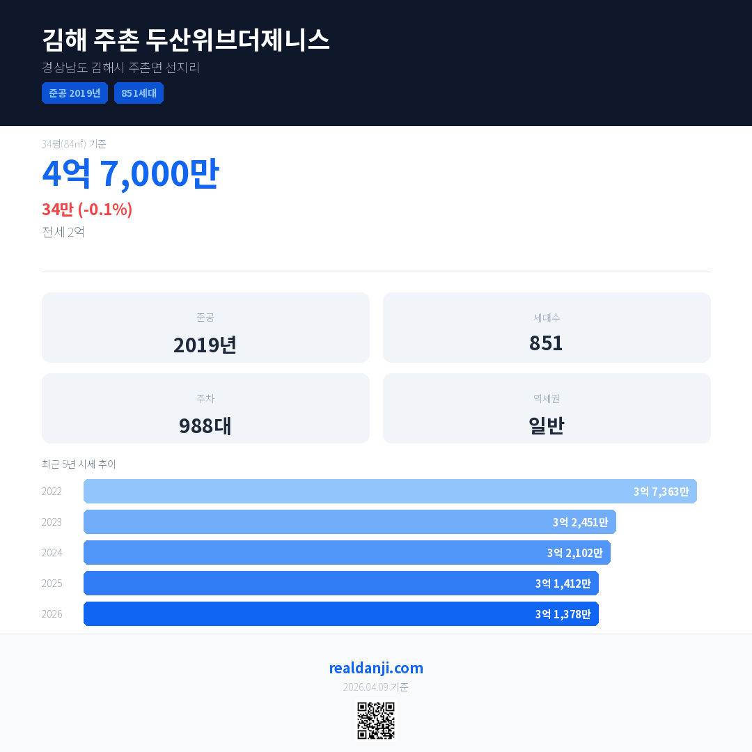 김해 주촌 두산위브더제니스 국민평형 기준 2026년 평균 거래가는 3억 1,378만으로, 전년 대비 0.1% 하락 했습니다.
