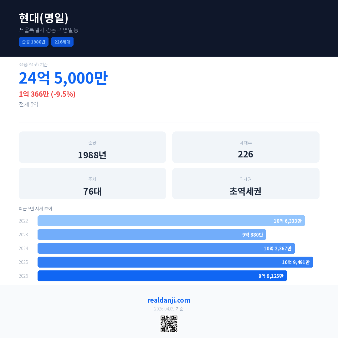 현대(명일) 최근 거래가는 24억 5,000만입니다. (2026-03)