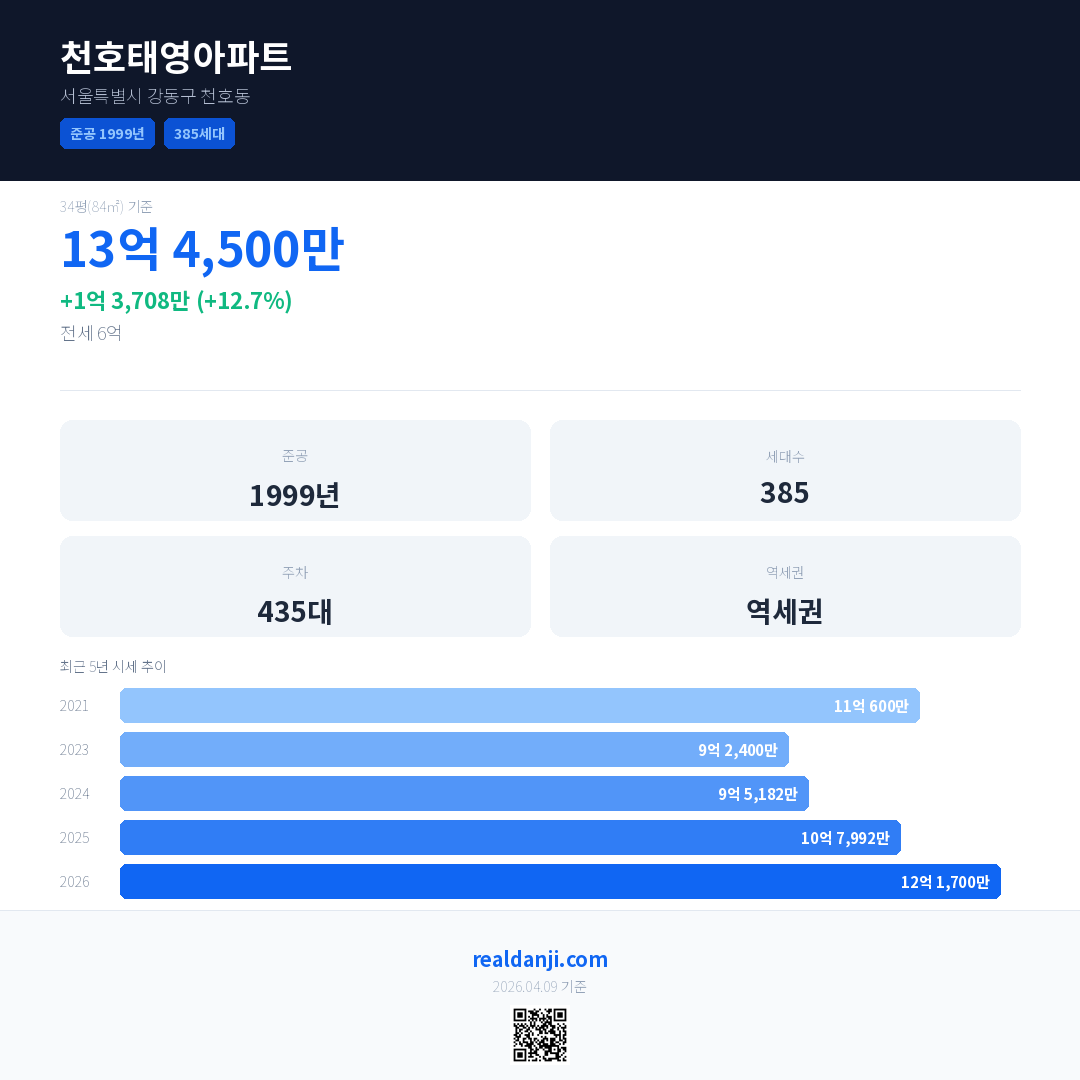 천호태영아파트 국민평형 기준 2026년 평균 거래가는 12억 1,700만으로, 전년 대비 12.7% 상승 했습니다.