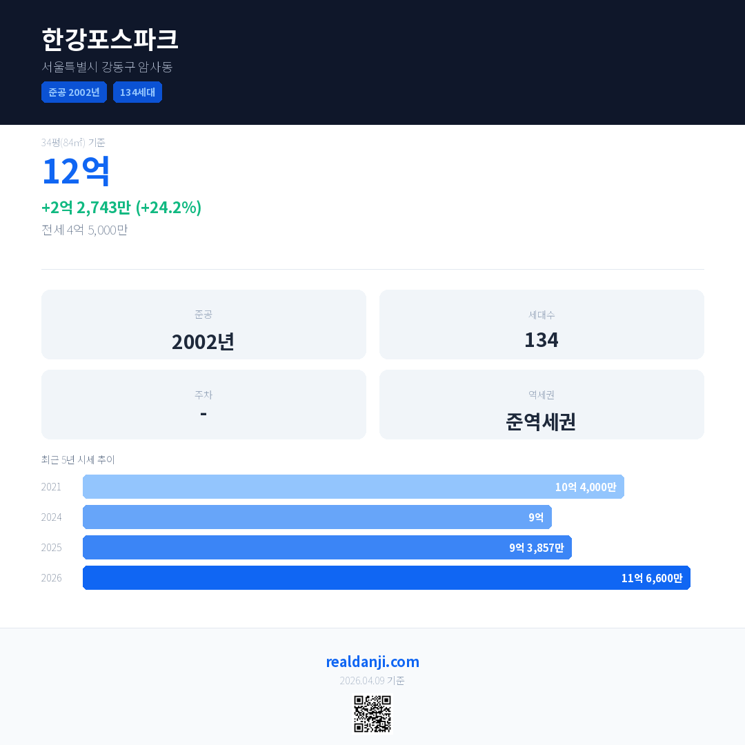 한강포스파크 국민평형 기준 2026년 평균 거래가는 11억 6,600만으로, 전년 대비 24.2% 상승 했습니다.