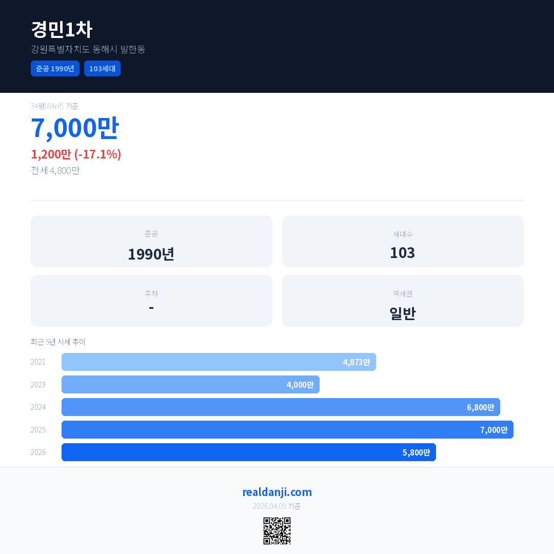 경민1차 국민평형 기준 2026년 평균 거래가는 5,800만으로, 전년 대비 17.1% 하락 했습니다.