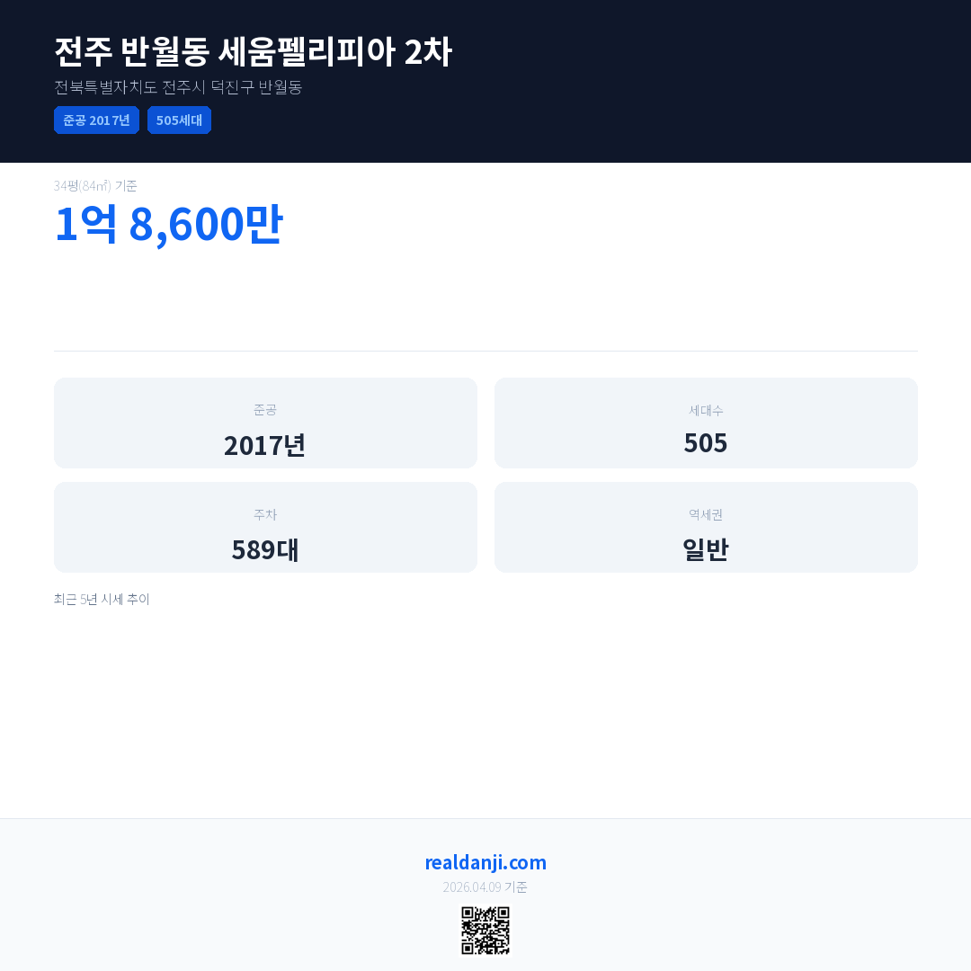 전주 반월동 세움펠리피아 2차은(는) 2017년에 준공되었으며, 현재 9년차입니다. 총 505세대 규모입니다.