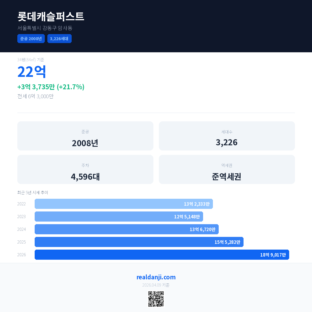 롯데캐슬퍼스트 국민평형 기준 2026년 평균 거래가는 18억 9,017만으로, 전년 대비 21.7% 상승 했습니다.