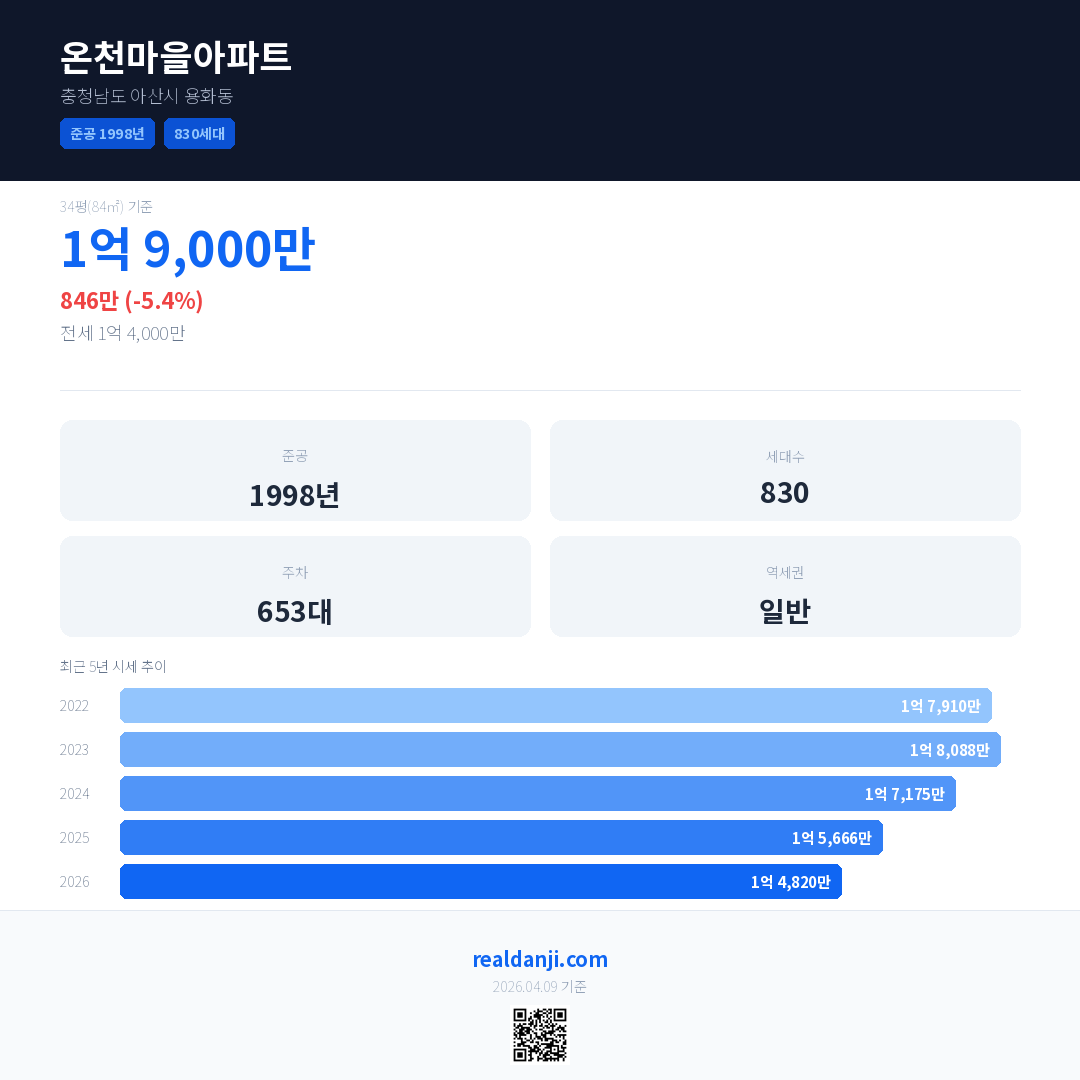 온천마을아파트 최근 거래가는 1억 9,000만입니다. (2026-04)