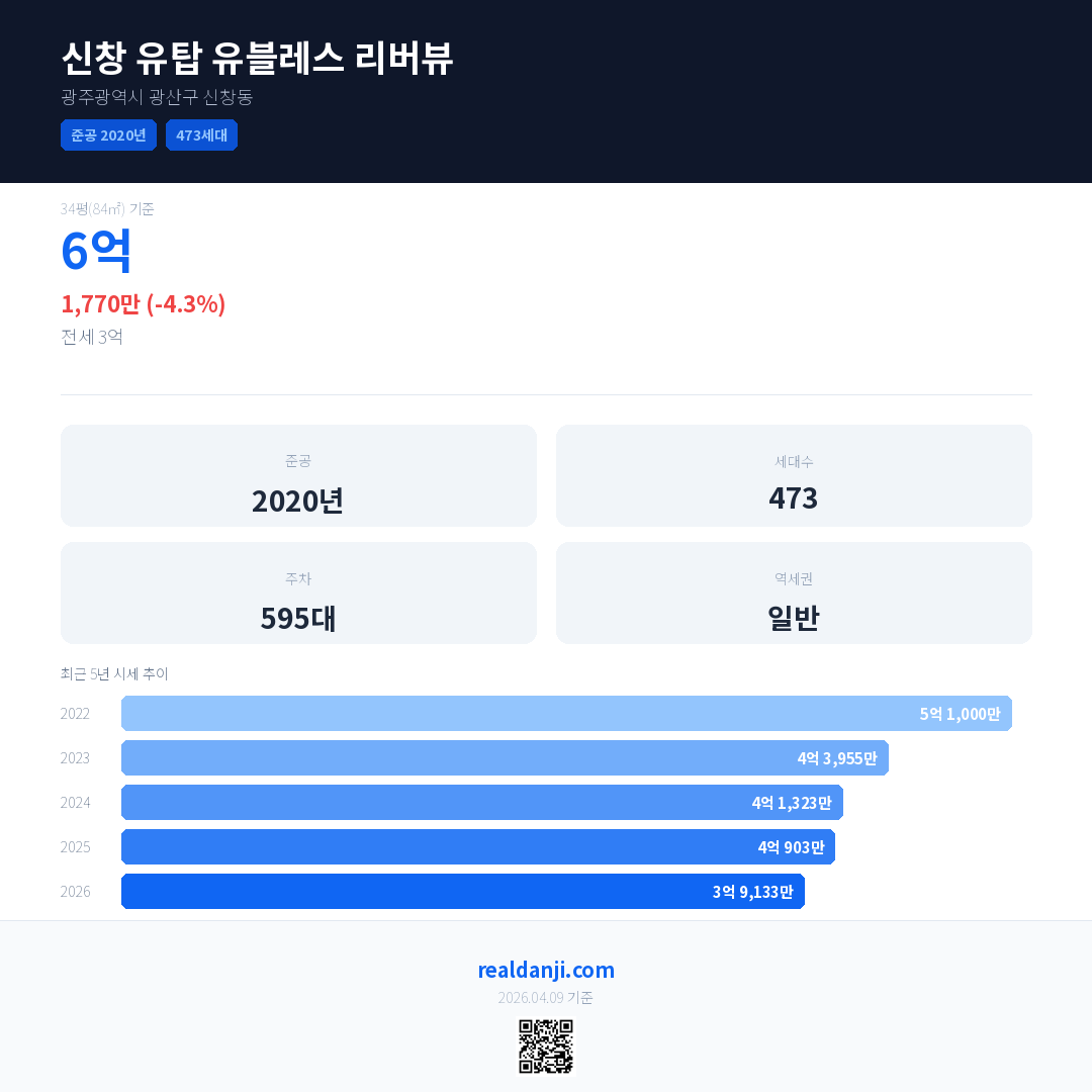 신창 유탑 유블레스 리버뷰 최근 거래가는 6억입니다. (2026-03)