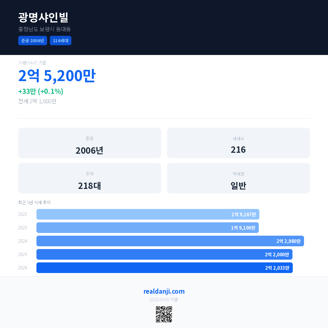 광명샤인빌 국민평형 기준 2026년 평균 거래가는 2억 2,033만으로, 전년 대비 0.1% 상승 했습니다.