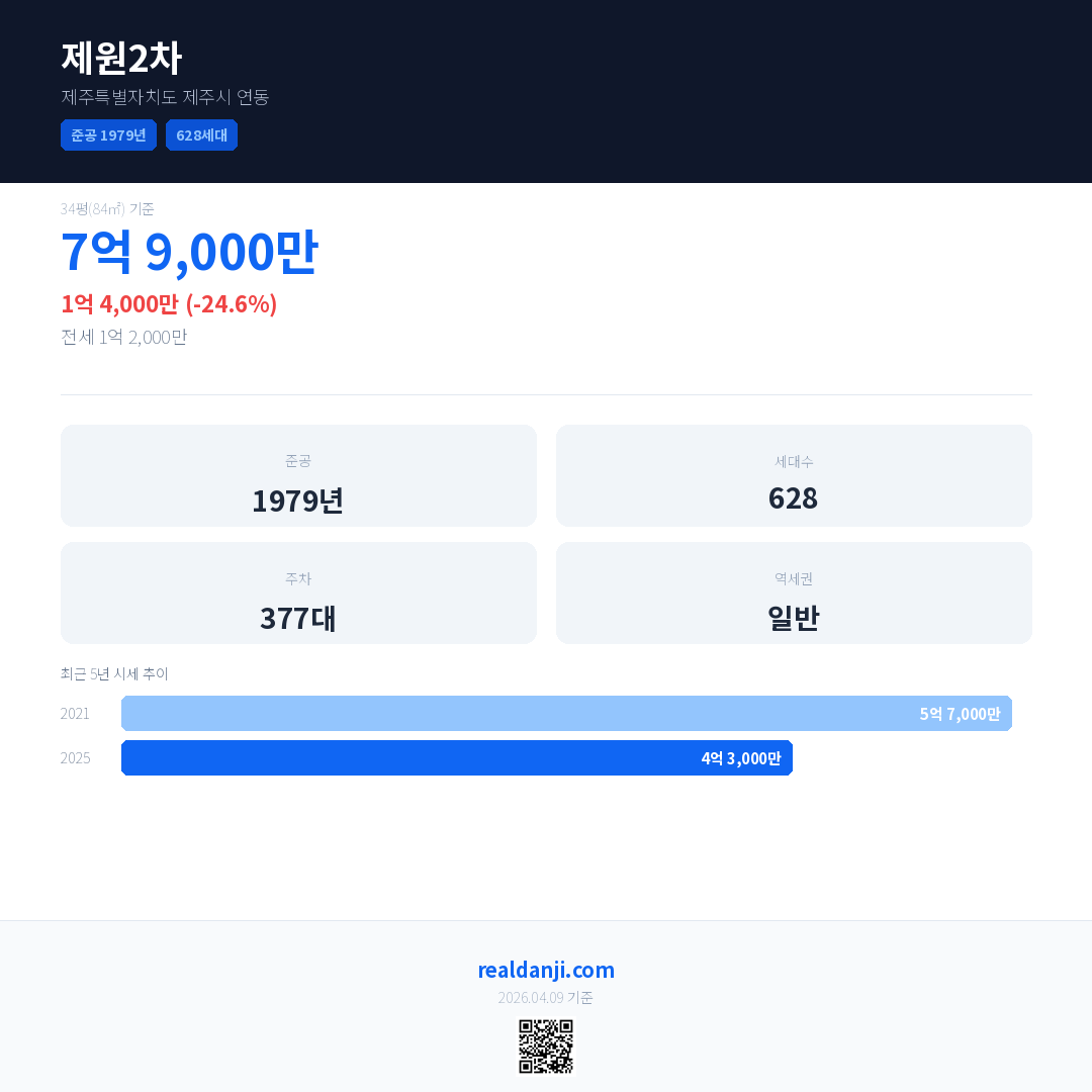 제원2차 국민평형 기준 2025년 평균 거래가는 4억 3,000만으로, 전년 대비 24.6% 하락 했습니다.