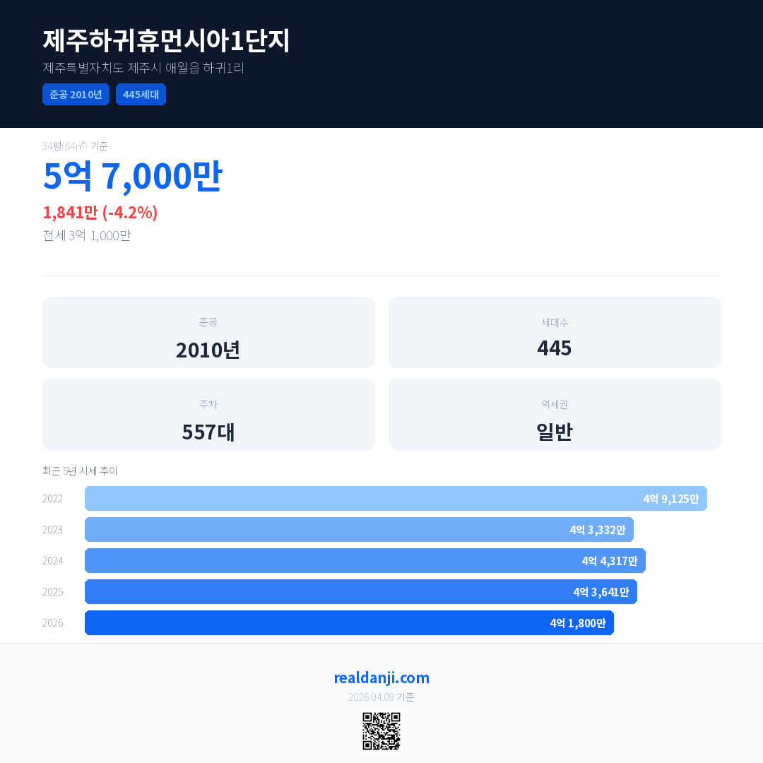 제주하귀휴먼시아1단지 국민평형 기준 2026년 평균 거래가는 4억 1,800만으로, 전년 대비 4.2% 하락 했습니다.