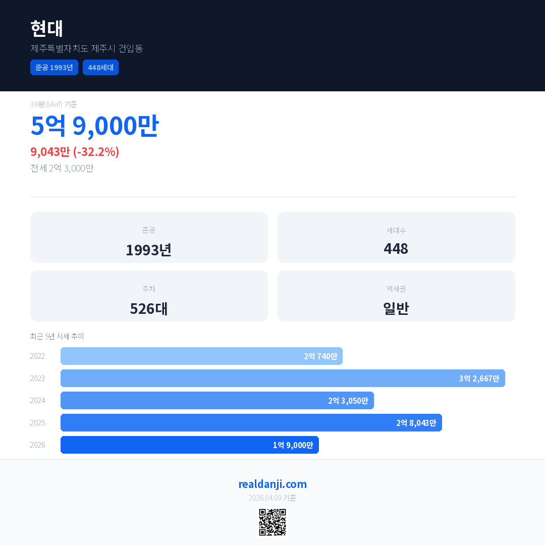 현대 국민평형 기준 2026년 평균 거래가는 1억 9,000만으로, 전년 대비 32.2% 하락 했습니다.