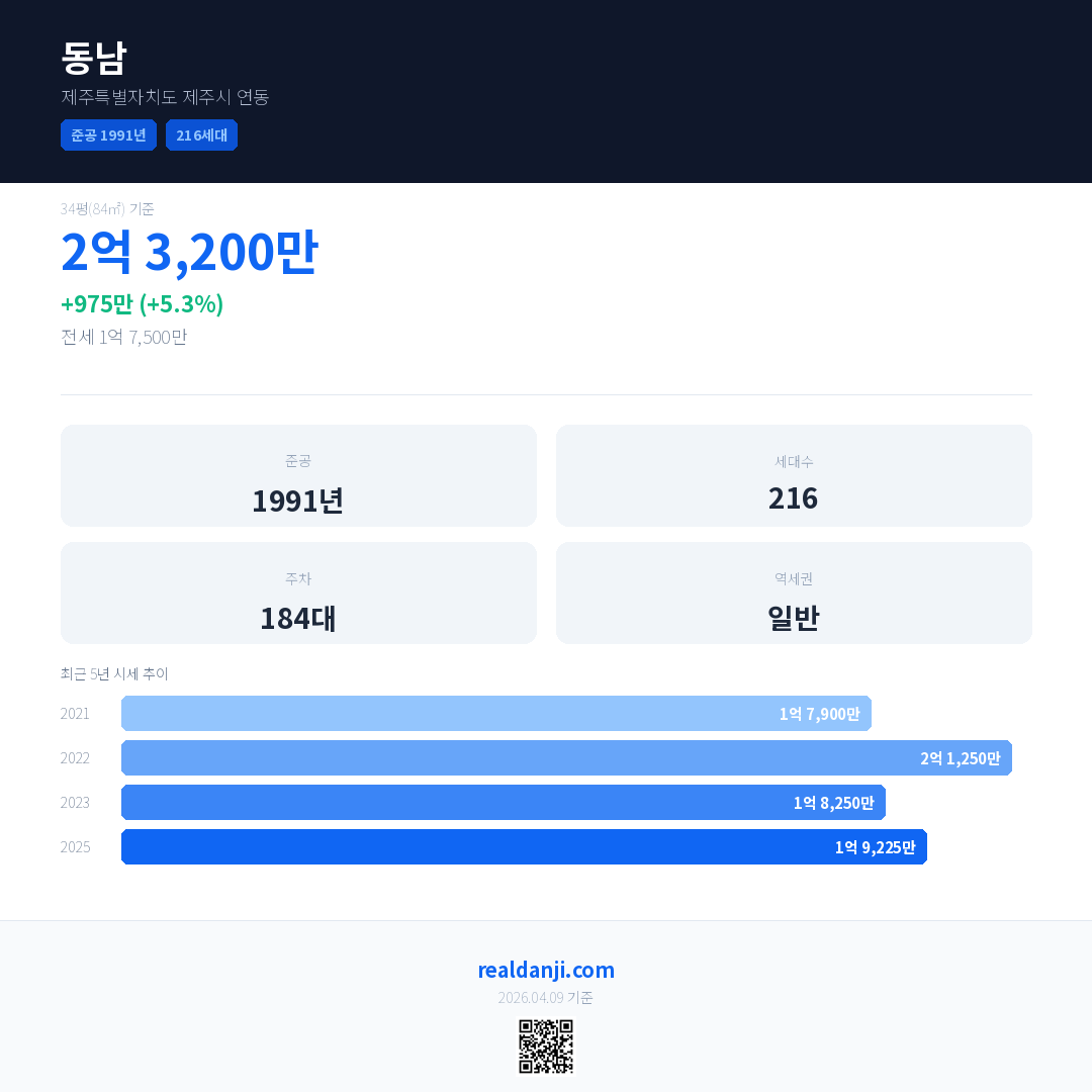동남 국민평형 기준 2025년 평균 거래가는 1억 9,225만으로, 전년 대비 5.3% 상승 했습니다.