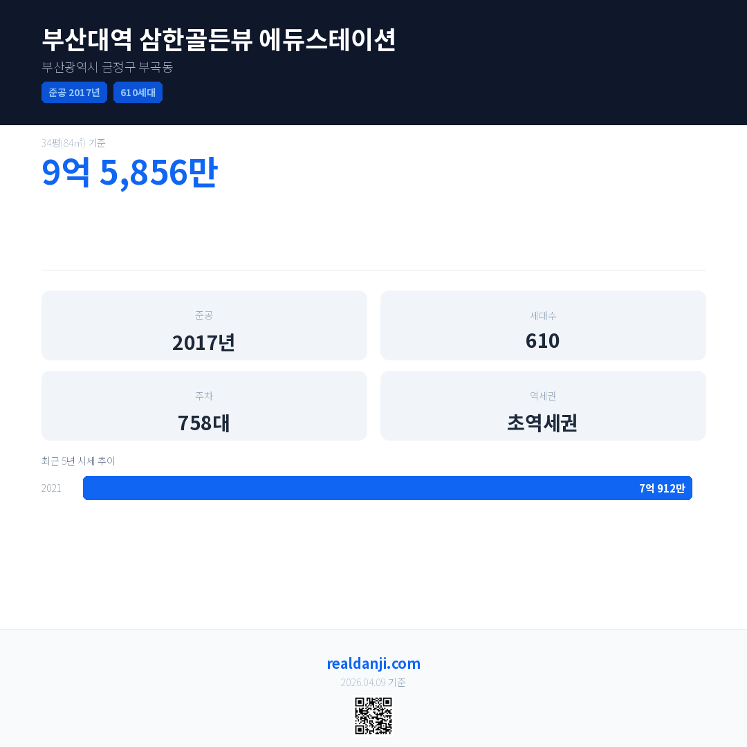 부산대역 삼한골든뷰 에듀스테이션 최근 거래가는 9억 5,856만입니다. (2021-06)