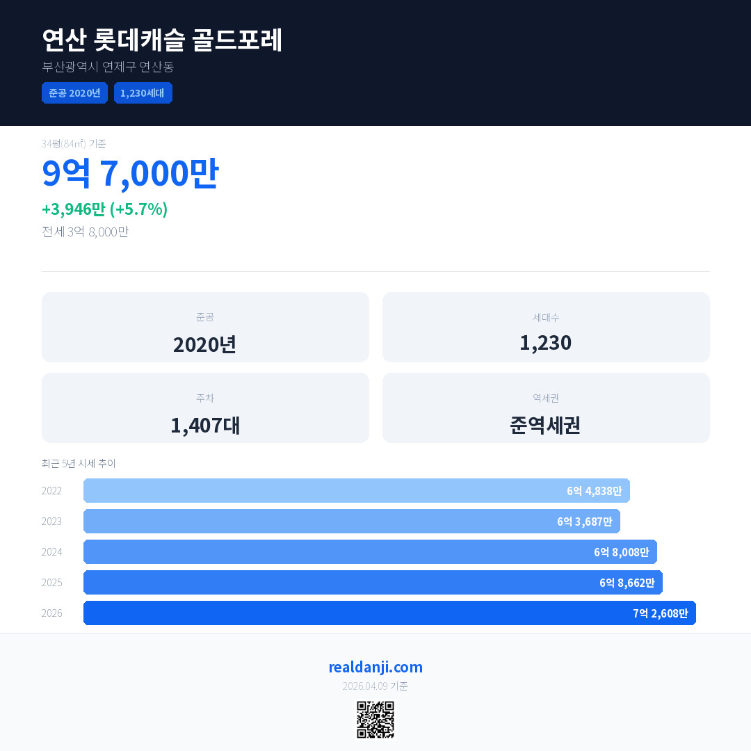 연산 롯데캐슬 골드포레 국민평형 기준 2026년 평균 거래가는 7억 2,608만으로, 전년 대비 5.7% 상승 했습니다.